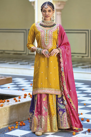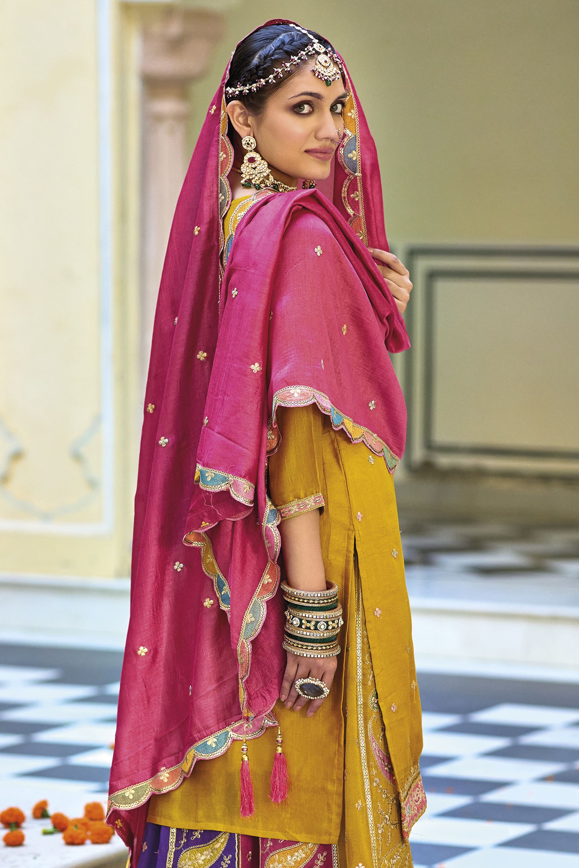 Mustard Color Art Silk Embroidery Work Sangeet Wear 3 Piece Sharara Style Readymade Lehenga