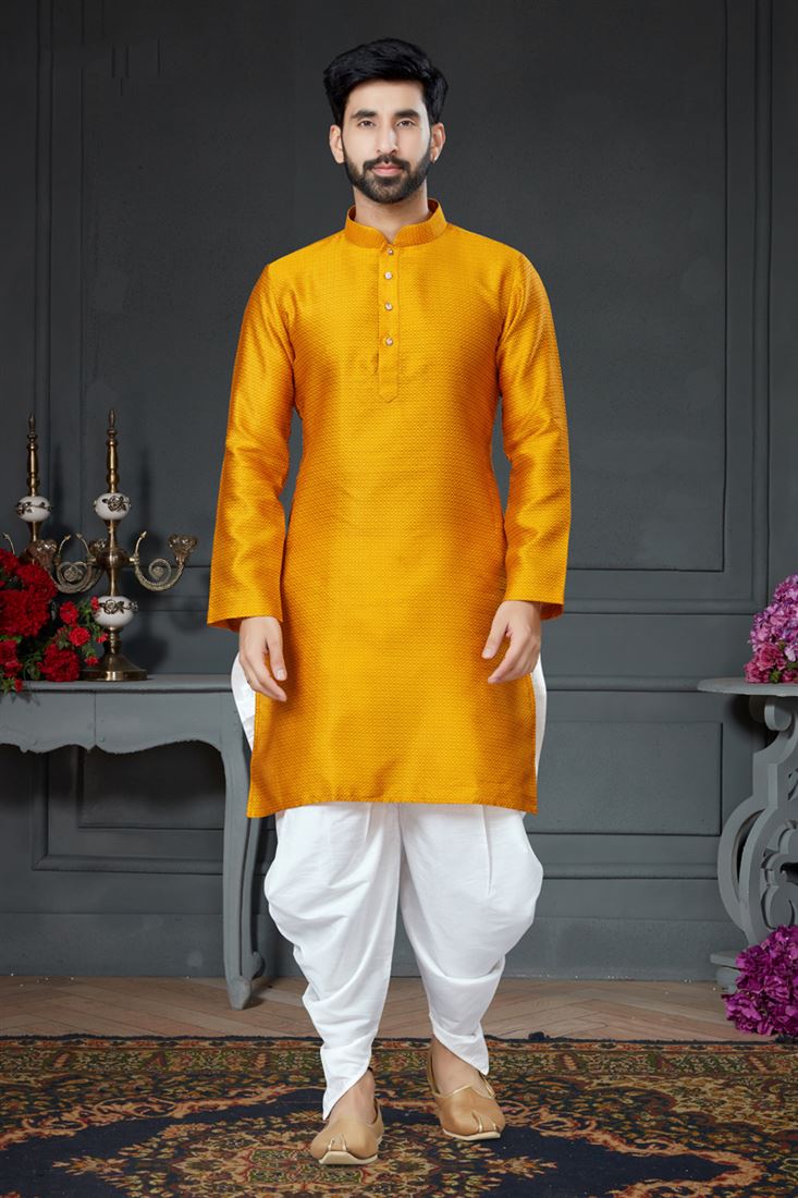 Mustard Color Cotton Silk Fabric Reception Wear Striking Dhoti Style Kurta Pyjama For Men