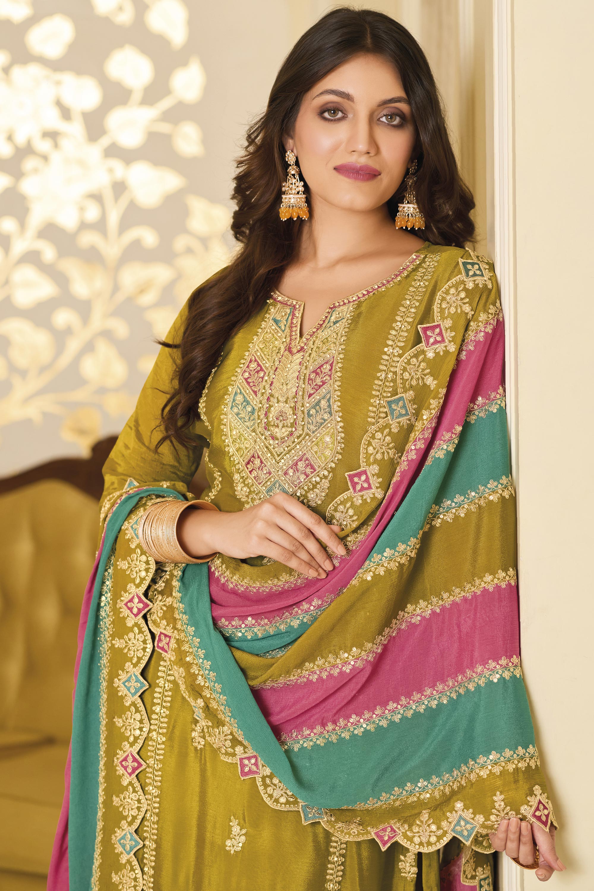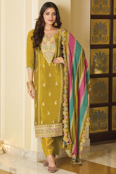 Mustard Color Embroidered Designer Suit In Art Silk Fabric