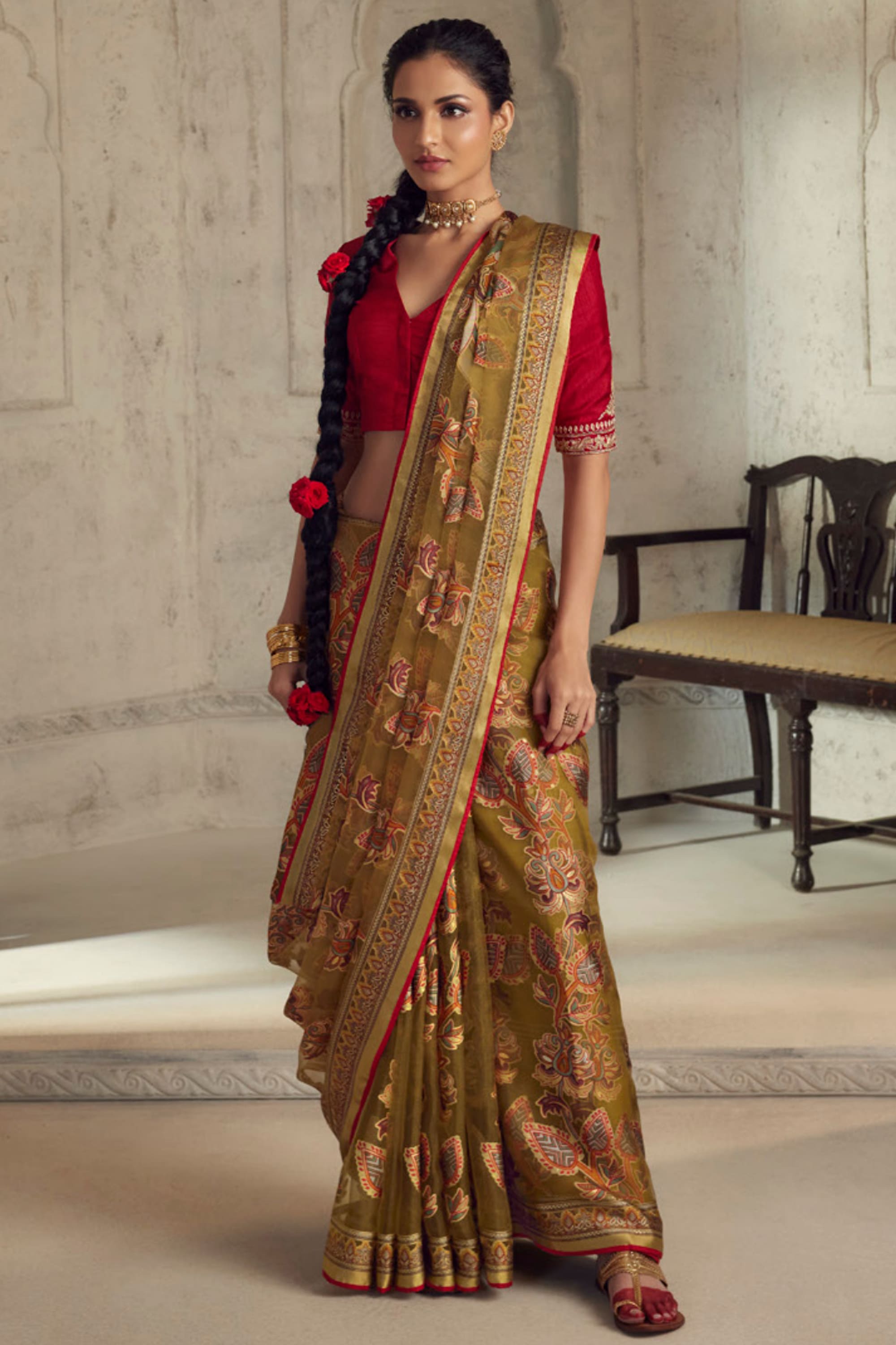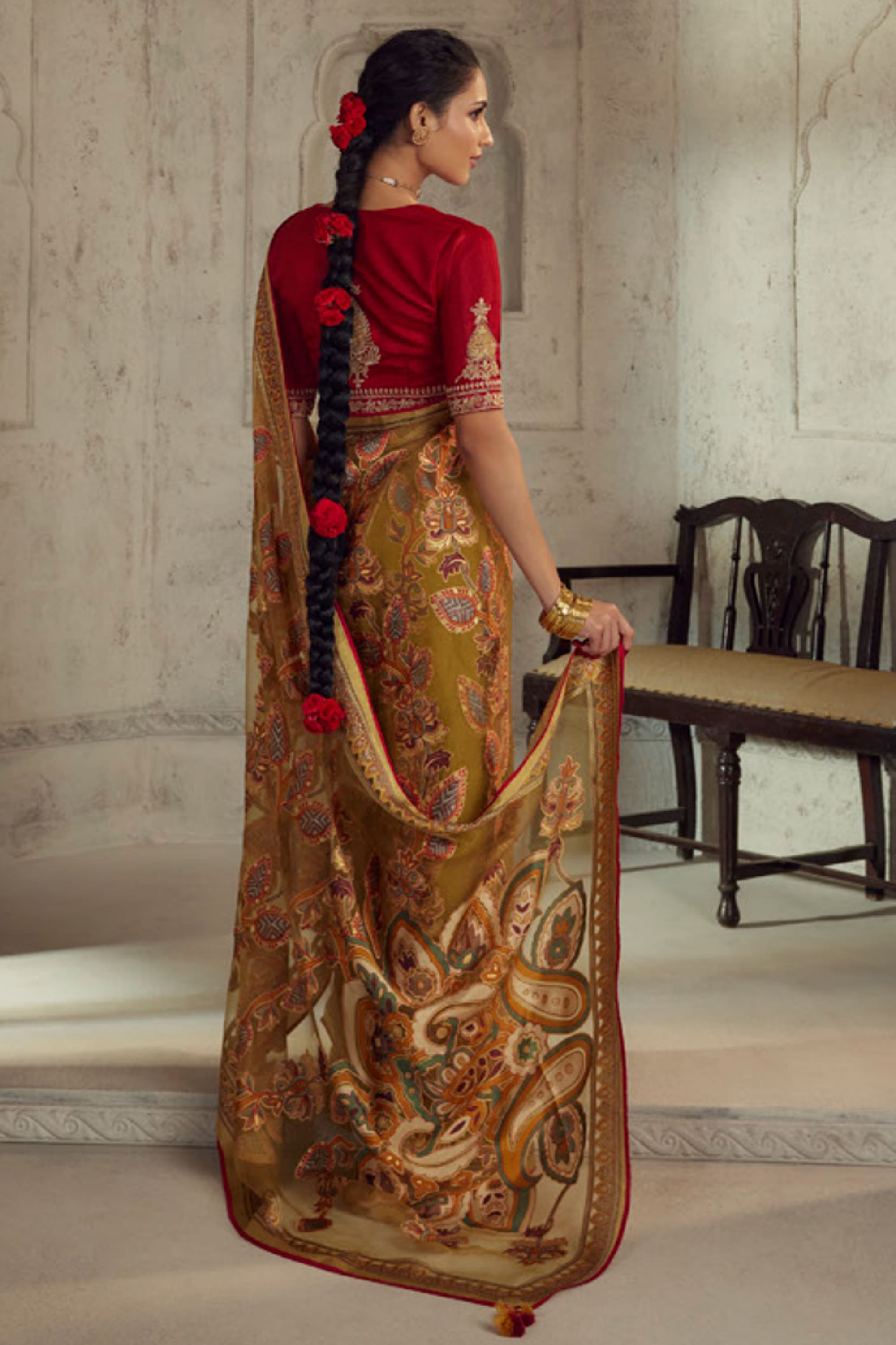 Mustard Color Festive Wear Organza Fabric Trendy Printed Saree With Embroidered Blouse