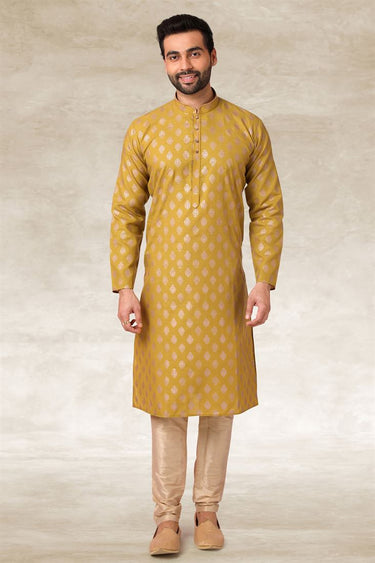 Mustard Color Function Wear Splendid Printed Work Kurta Pyjama In Cotton Fabric