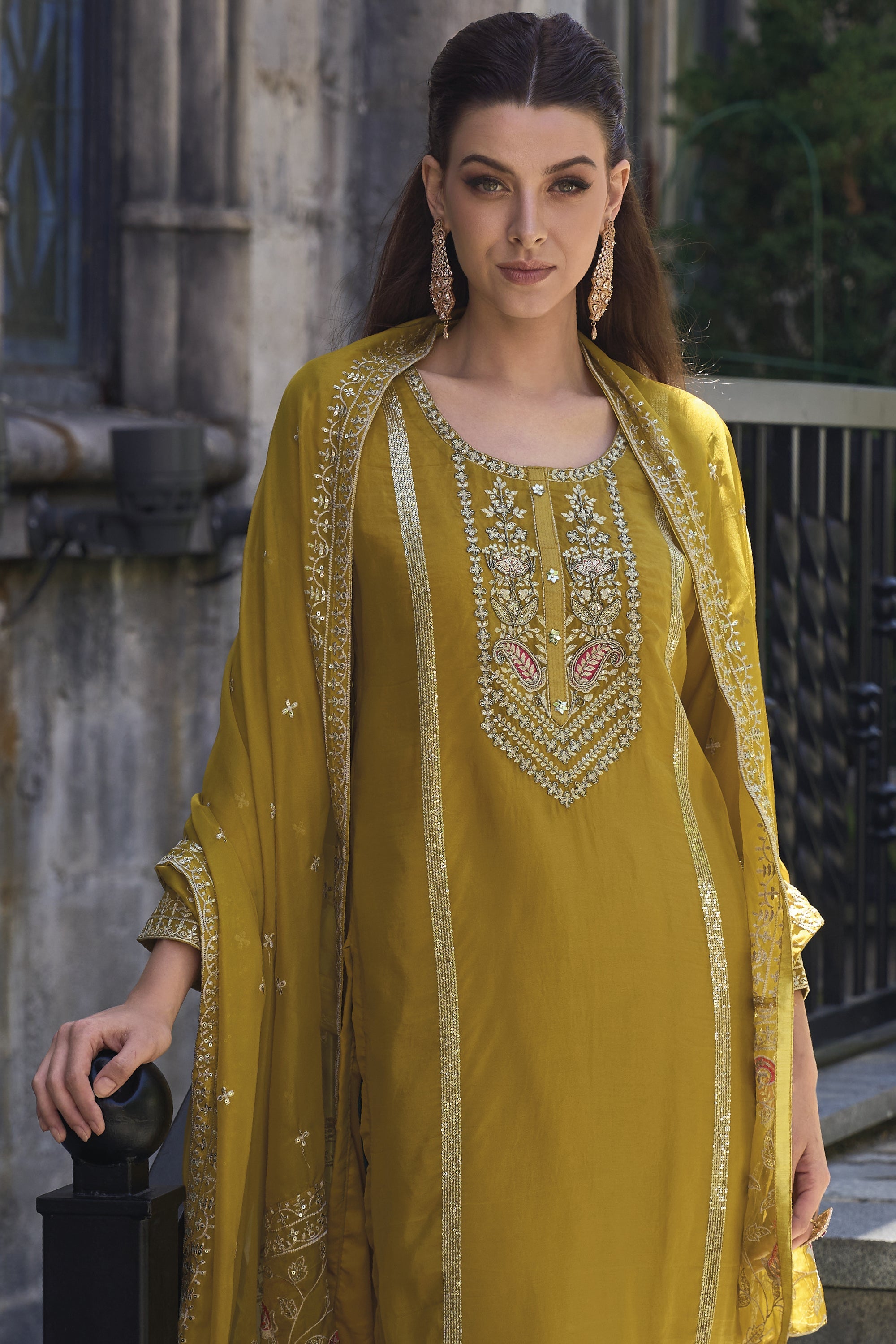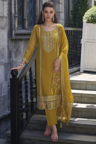 Mustard Color Organza Fabric Fancy Embroidered Function Wear Readymade Straight Cut Salwar Suit