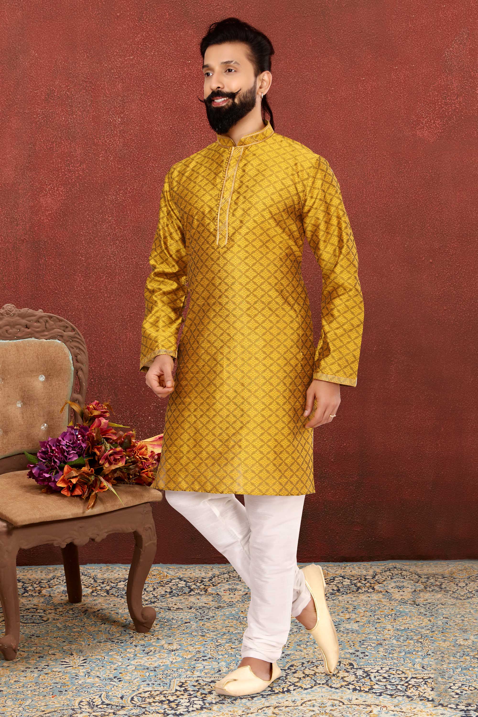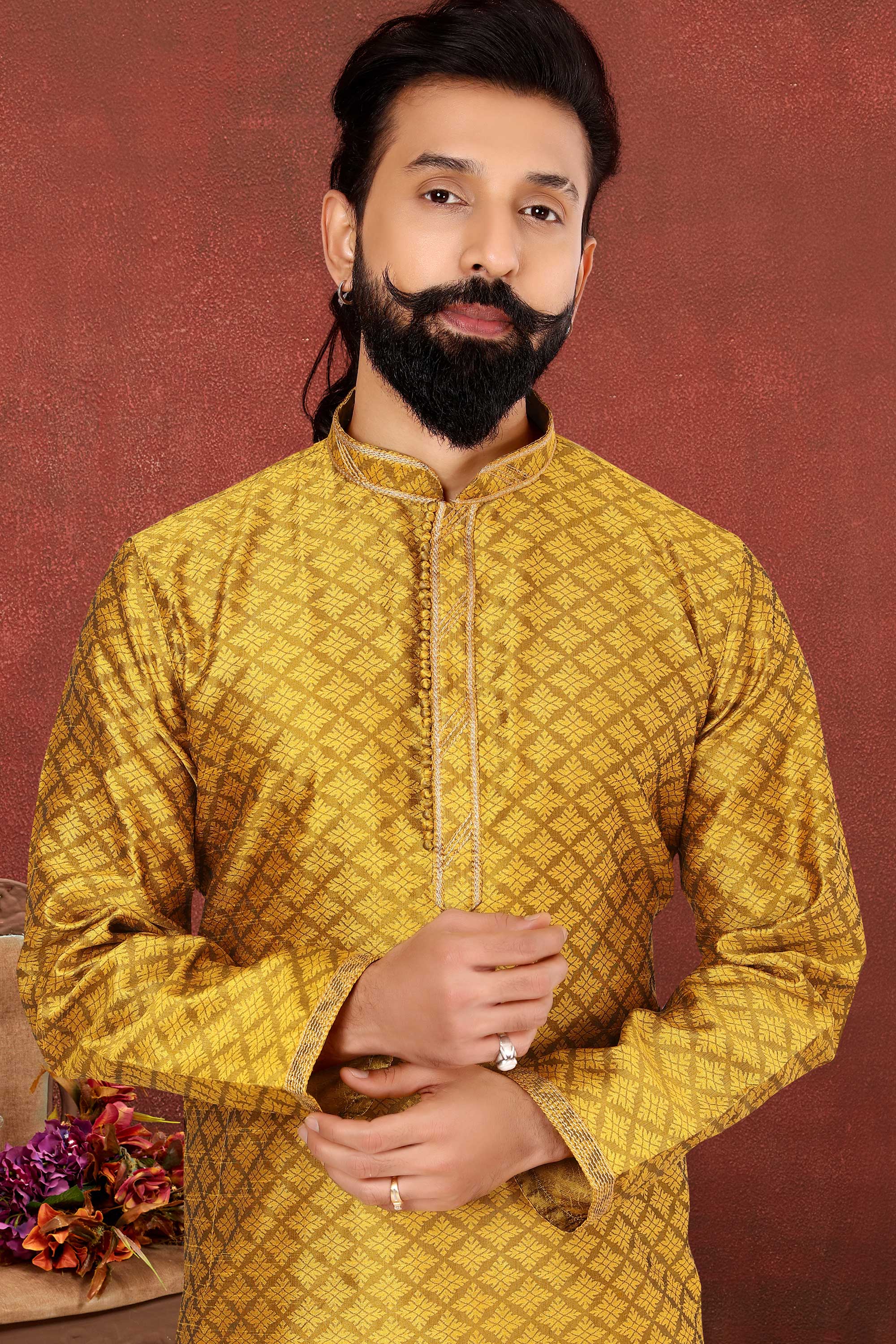Mustard Color Readymade Glamorous Kurta Pyjama For Men In Fancy Fabric