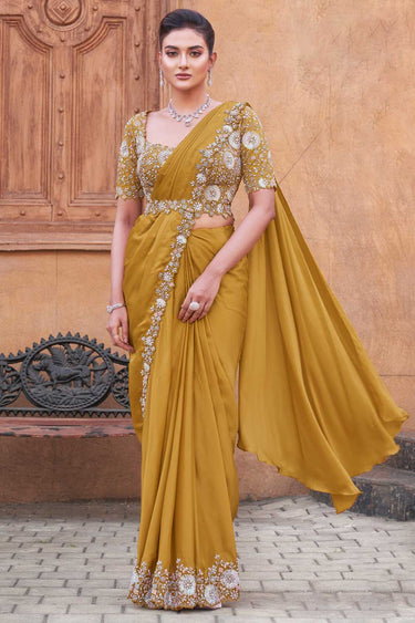 Mustard Crepe Satin Silk Hand Work Ready to wear saree