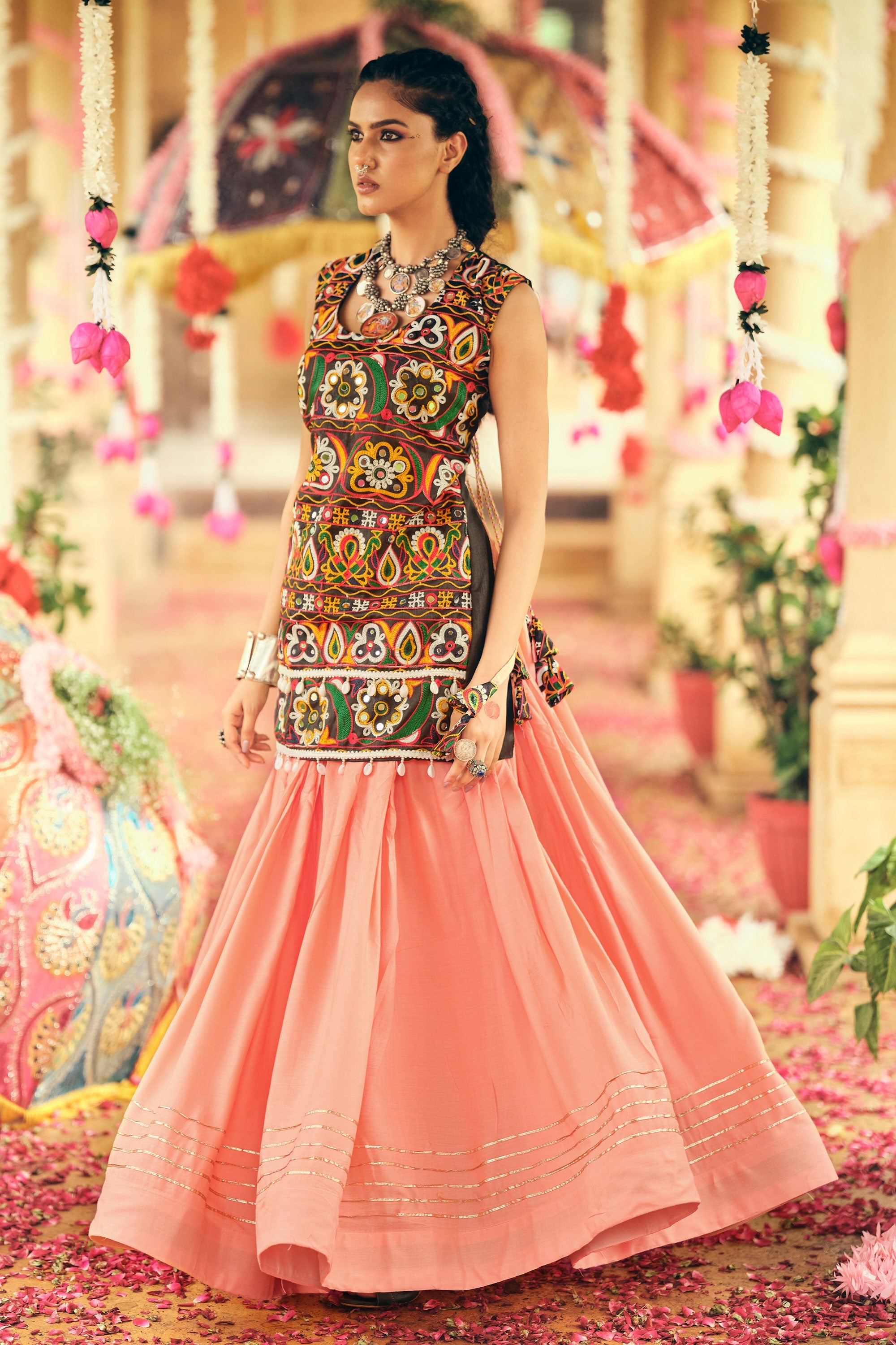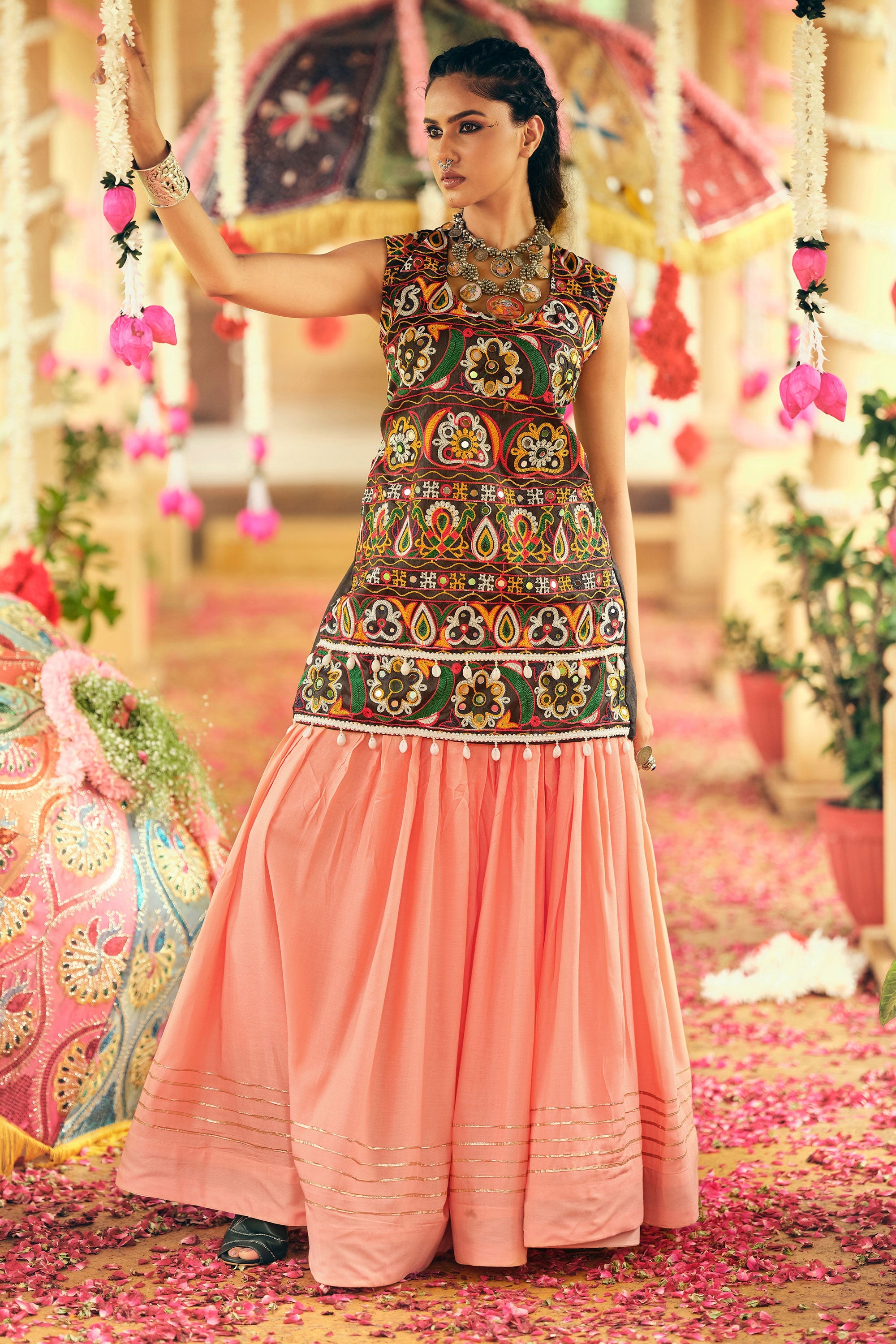 Navratri Special Peach Embroidered Work Top With Skirt For Garba Night