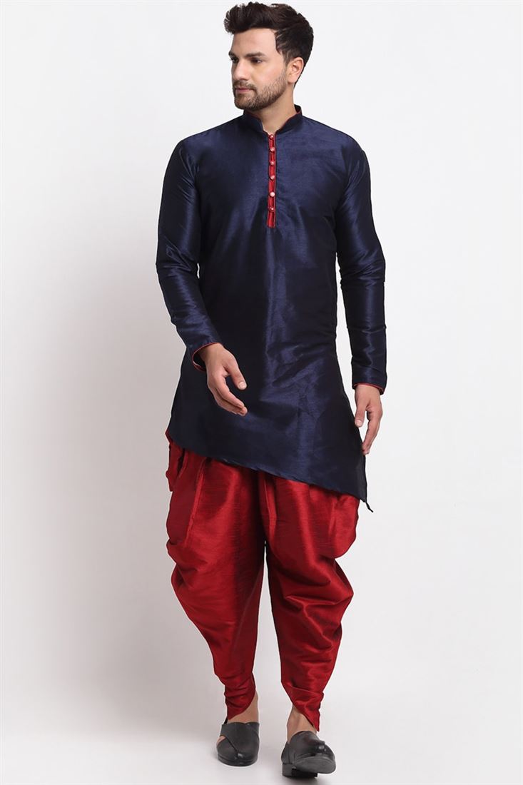 Navy Blue Color Art Silk Fabric Festive Wear Trendy Readymade Dhoti Style Kurta Pyjama For Men