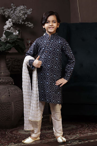 Navy Blue Color Cotton Fabric Printed Reception Wear Readymade Boys Kurta Pyjama