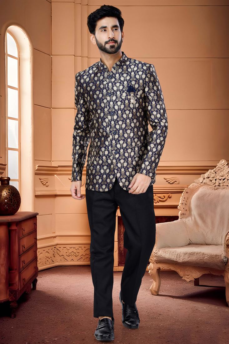 Navy Blue Jacquard Fabric Jodhpuri Suit