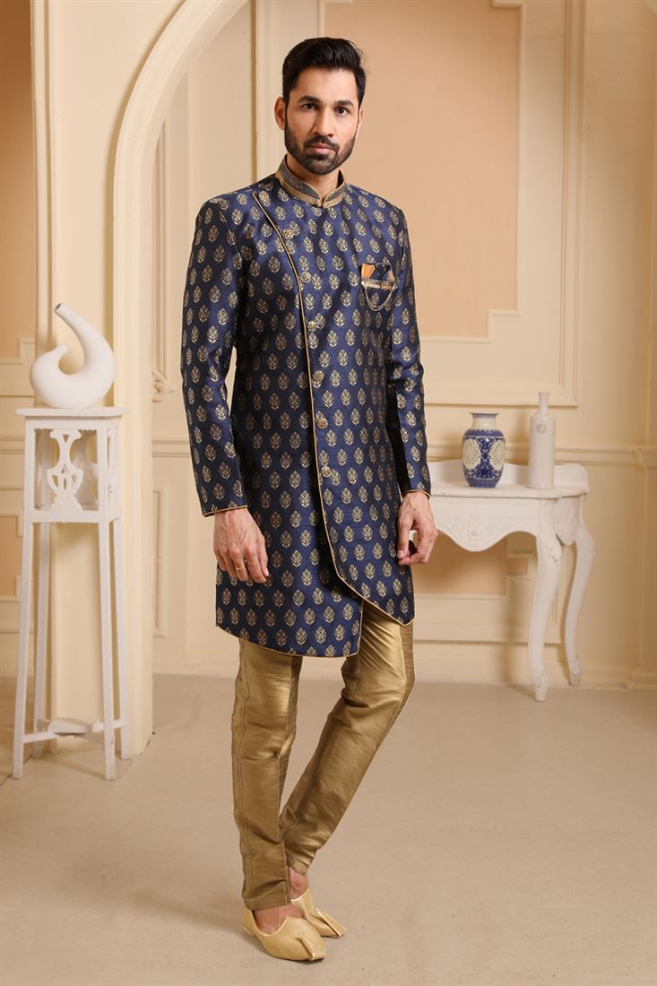 Navy Blue Jacquard Silk Sangeet Wear Readymade Indo Western For Men