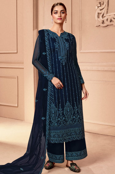 Navy Blue Net Embroidery Festive Wear Palazzo Suit