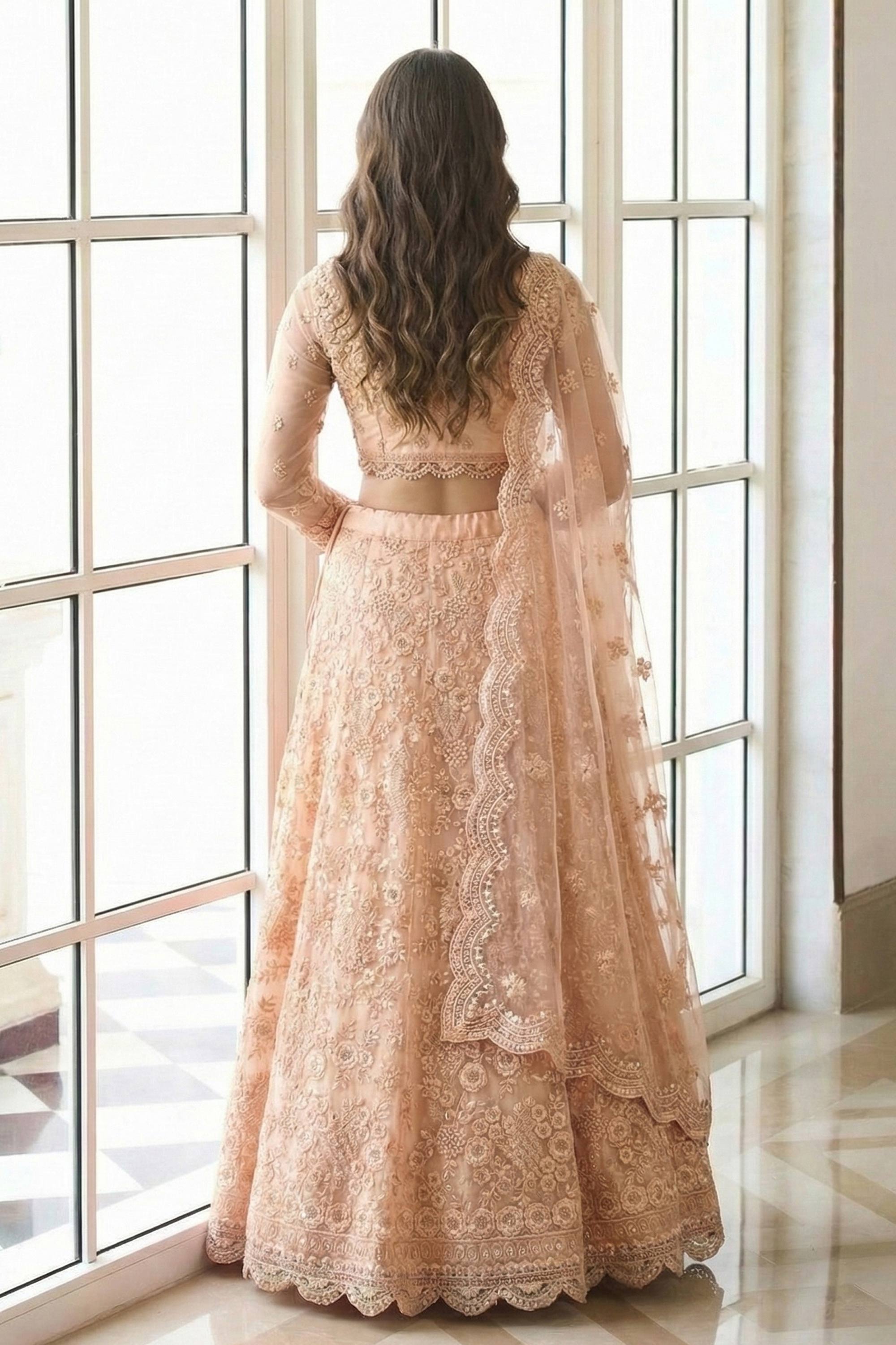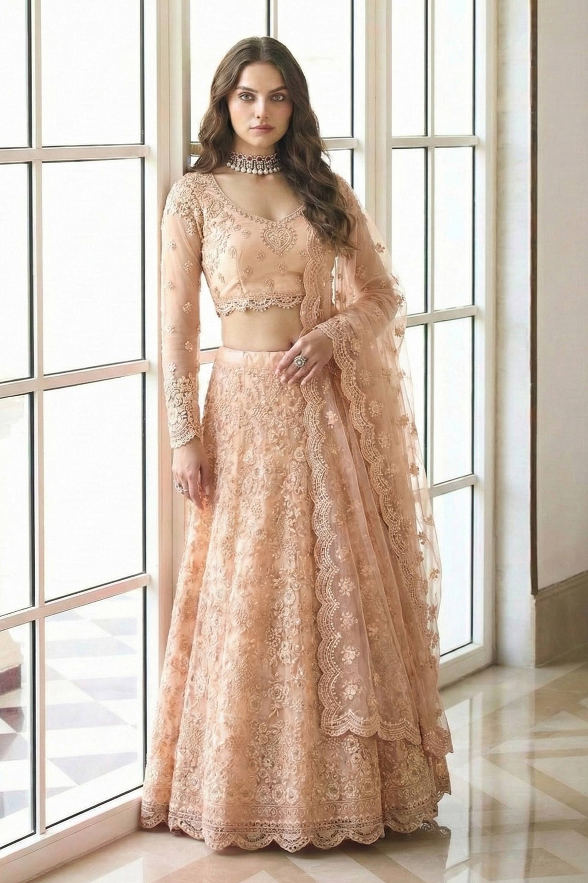 Net Embroidered Peach Wedding Wear Lehenga Choli With Dupatta