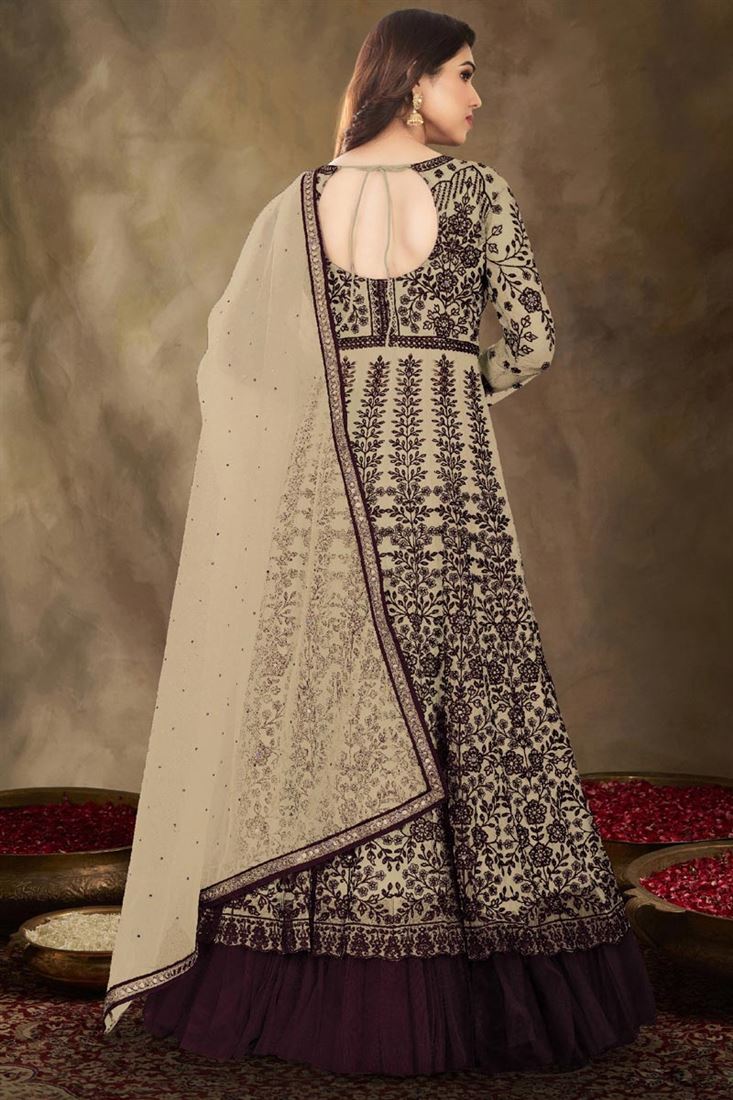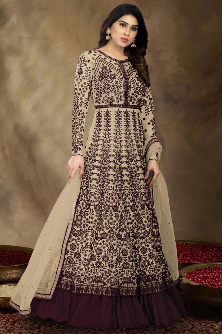 Net Fabric Beige Color Glittering Anarkali Suit In Sangeet Wear