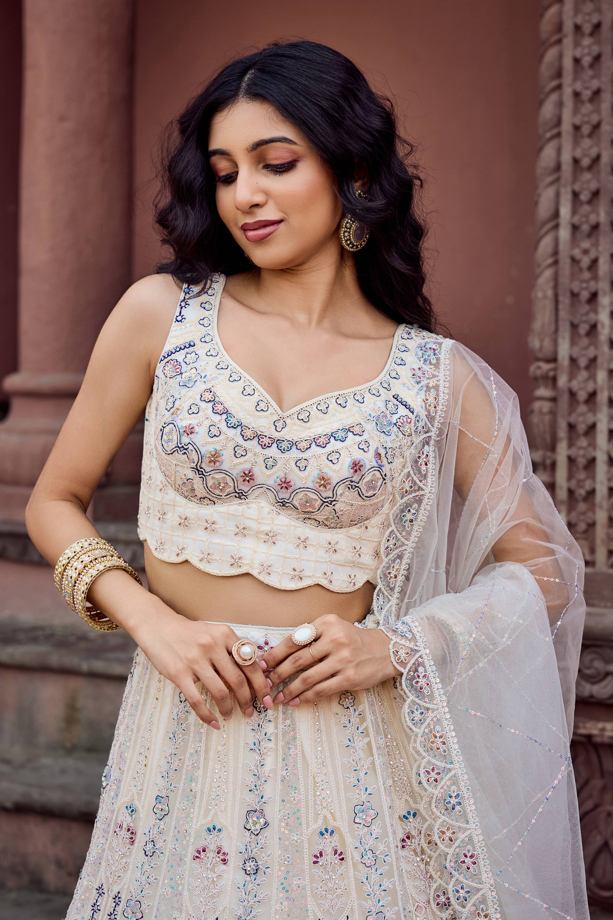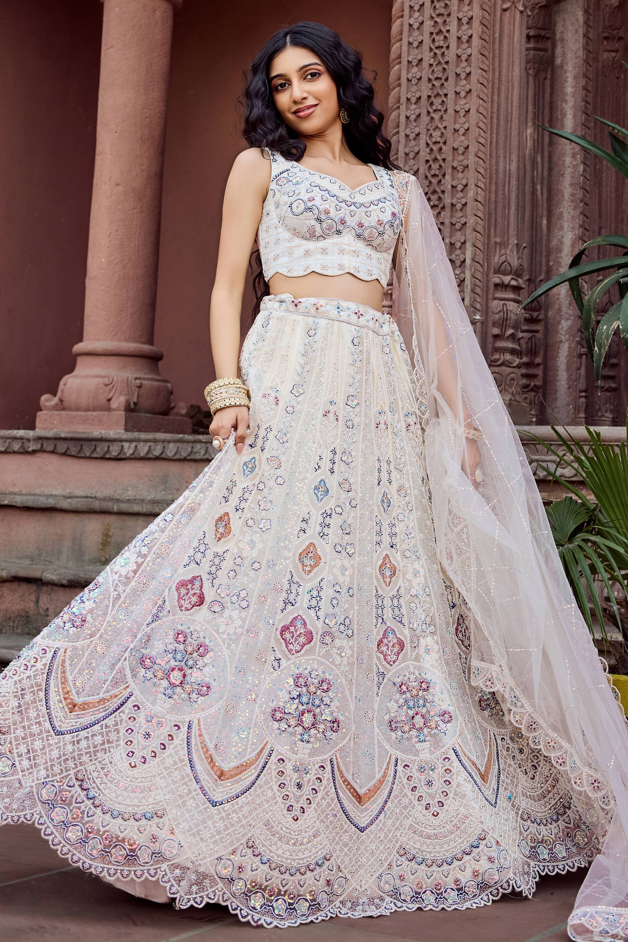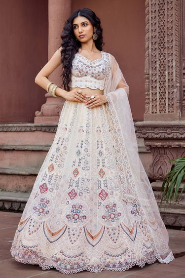 Net Fabric Cream Wedding Wear Lehenga Choli With Dupatta