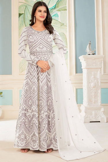 Net Fabric Embroidered Sangeet Wear Long Anarkali Salwar Kameez In White Color