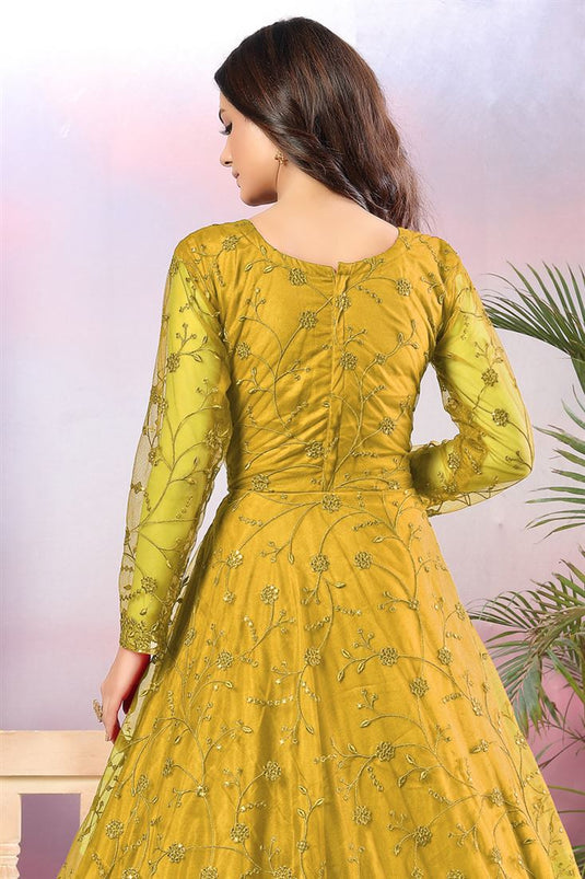 Net Fabric Party Wear Yellow Color Embroidered Anarkali Salwar Suit