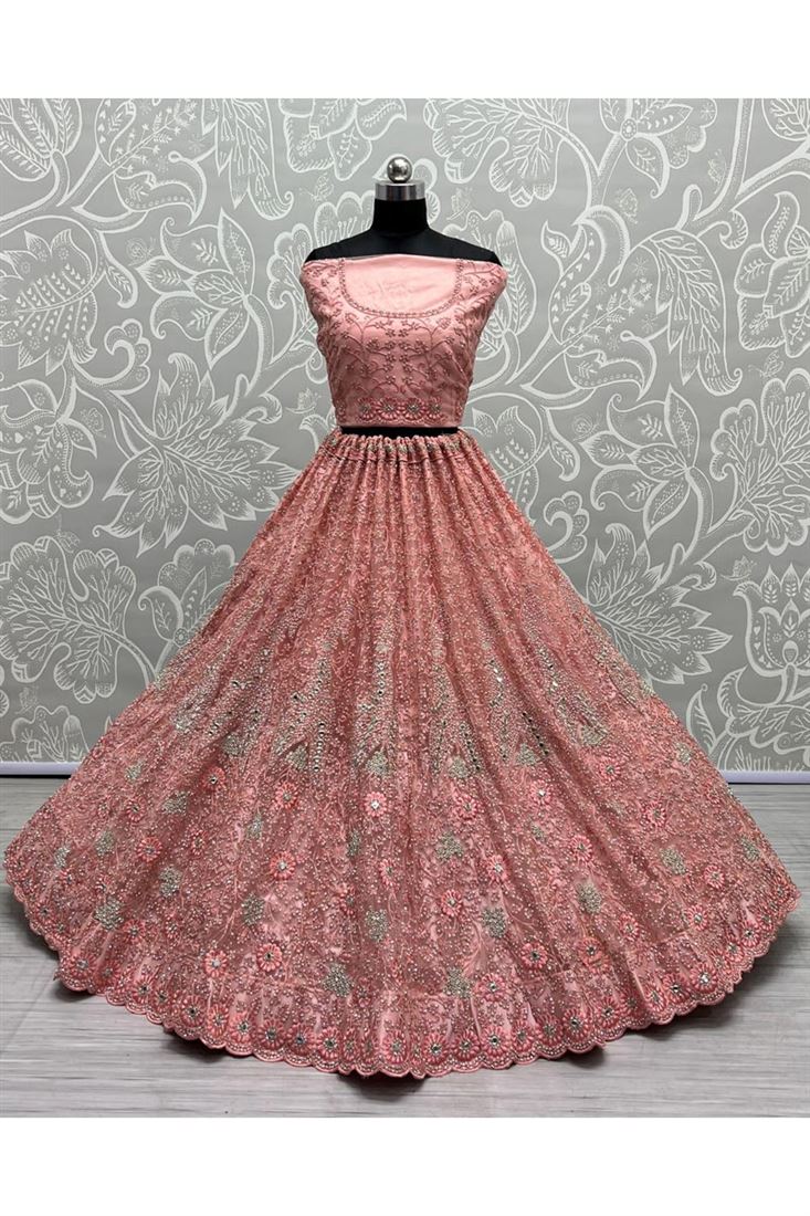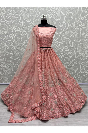 Net Fabric Peach Color Elegant Wedding Look Bridal Lehenga