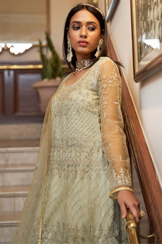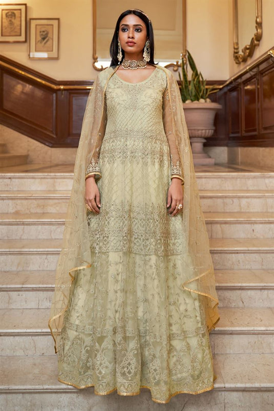 Net Fabric Sangeet Wear Beige Color Anarkali Suit