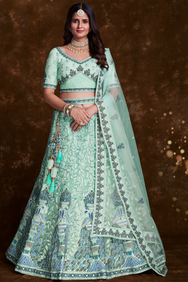 Net Sea Green Wedding Wear 3 Piece Lehenga Choli With Embroidery Work