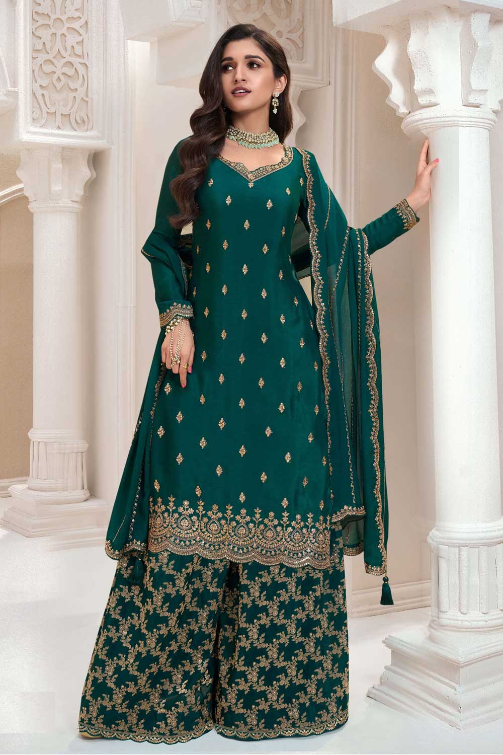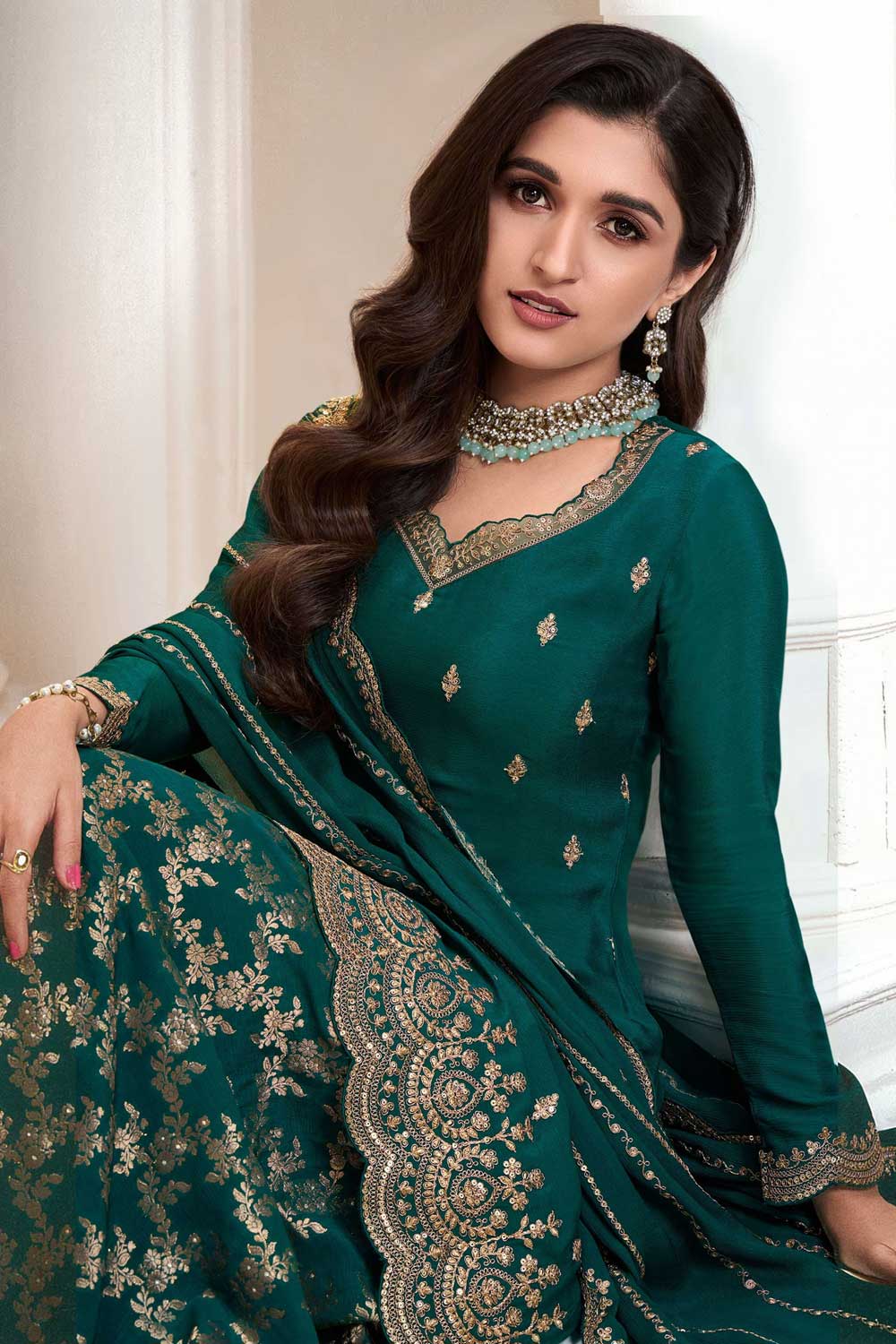 Nidhi Shah Chinon Fabric Green Color Elegant Palazzo Suit