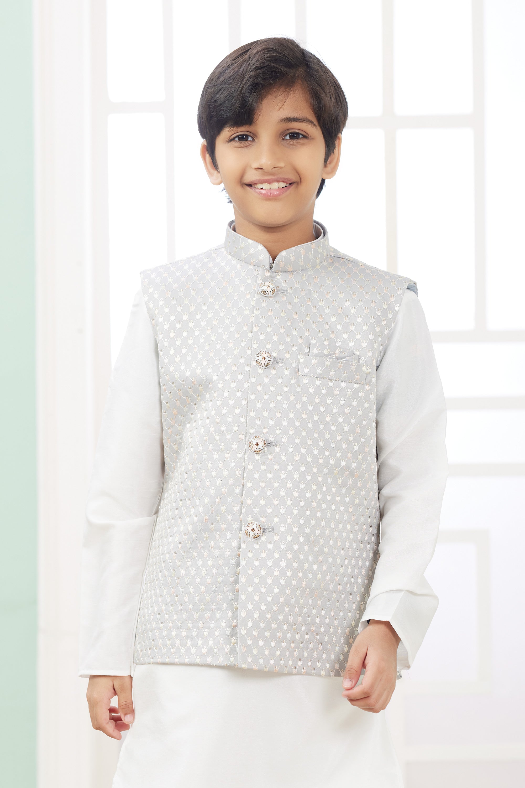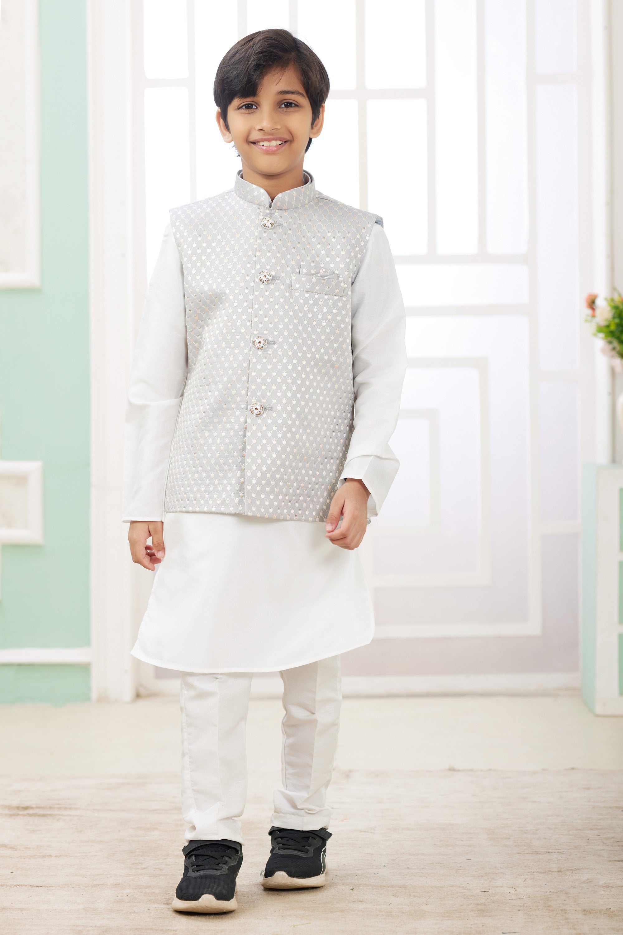 Occasion Wear Off White Art Silk Readymade Boys Kurta Pyjama With Designer Jacket