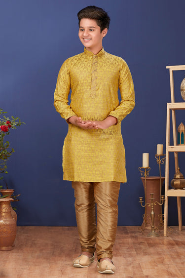 Occasion Wear Trendy Readymade Kurta Pyjama For Boys In Yellow Color Jacquard Silk Fabric