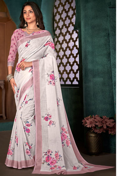 Off White Color Casual Wear Cotton Linen Fabric Awesome Digital Printed Saree