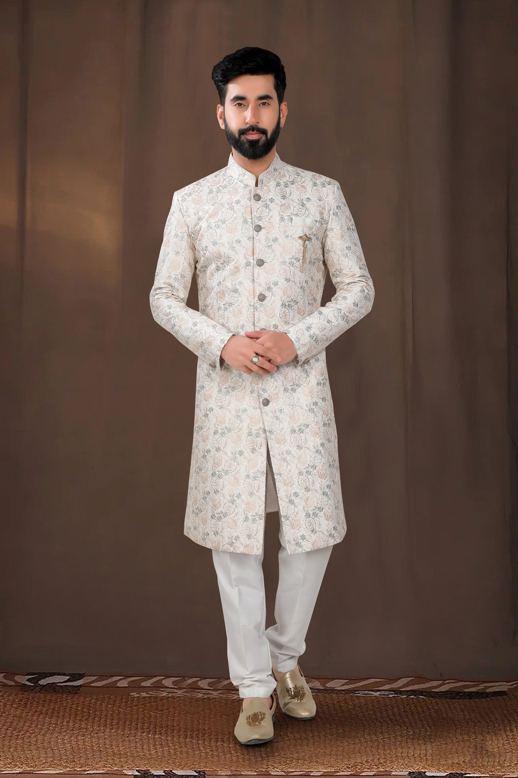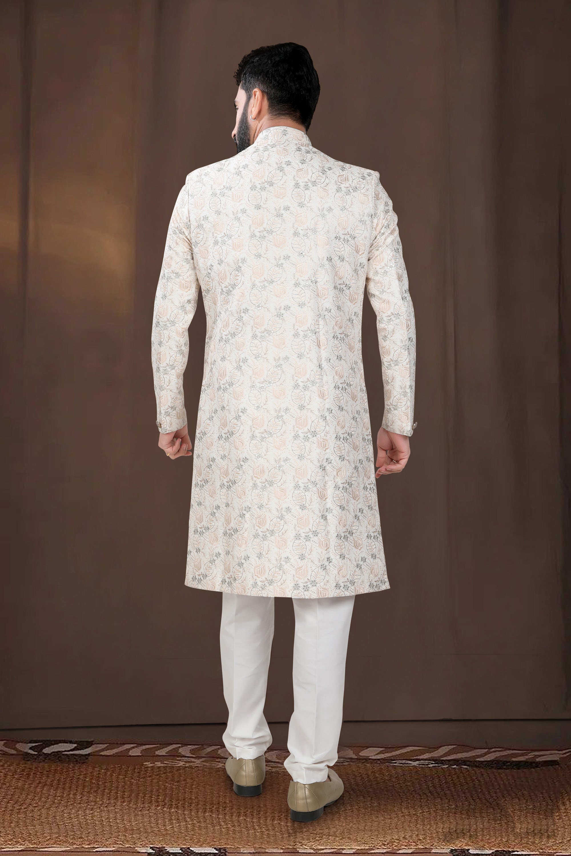 Off White Silk Wedding Wear Designer Readymade Indo Western For Men