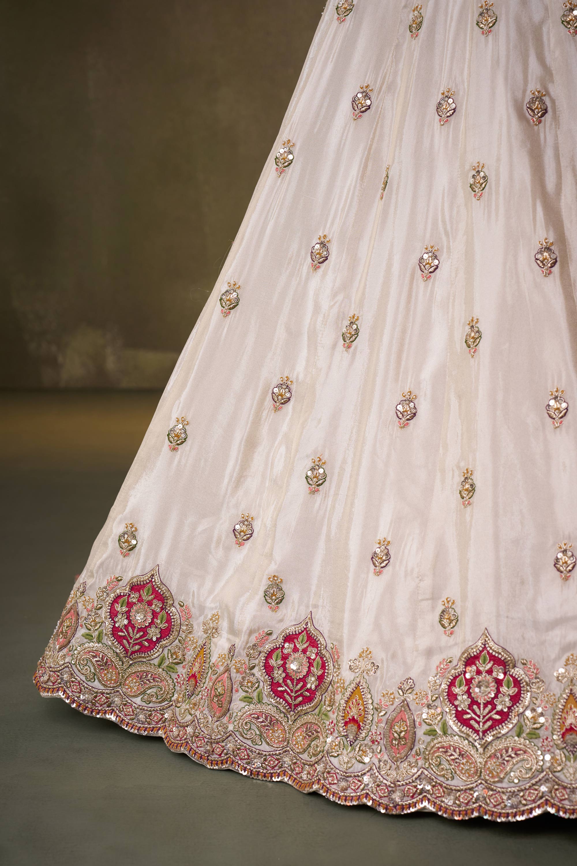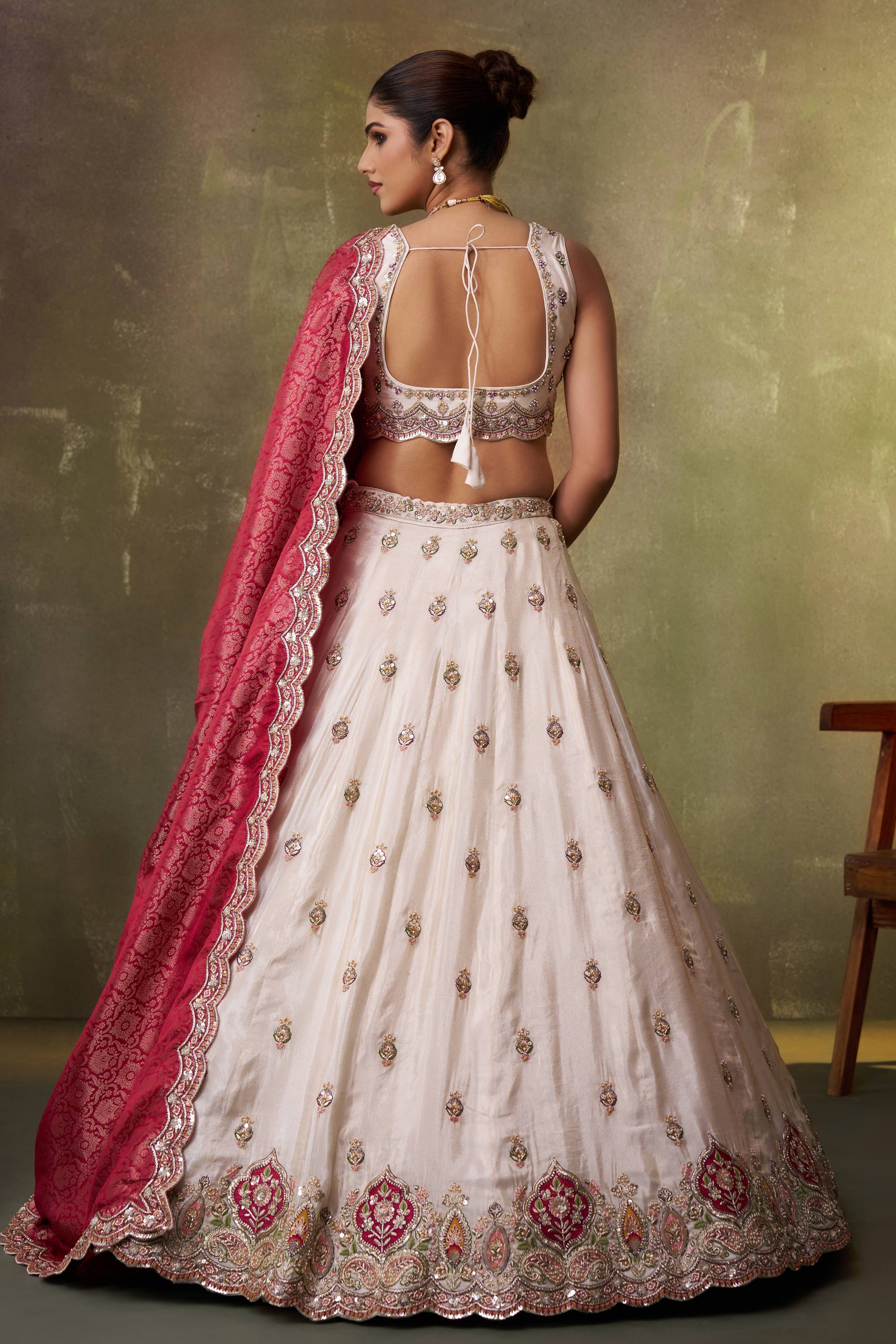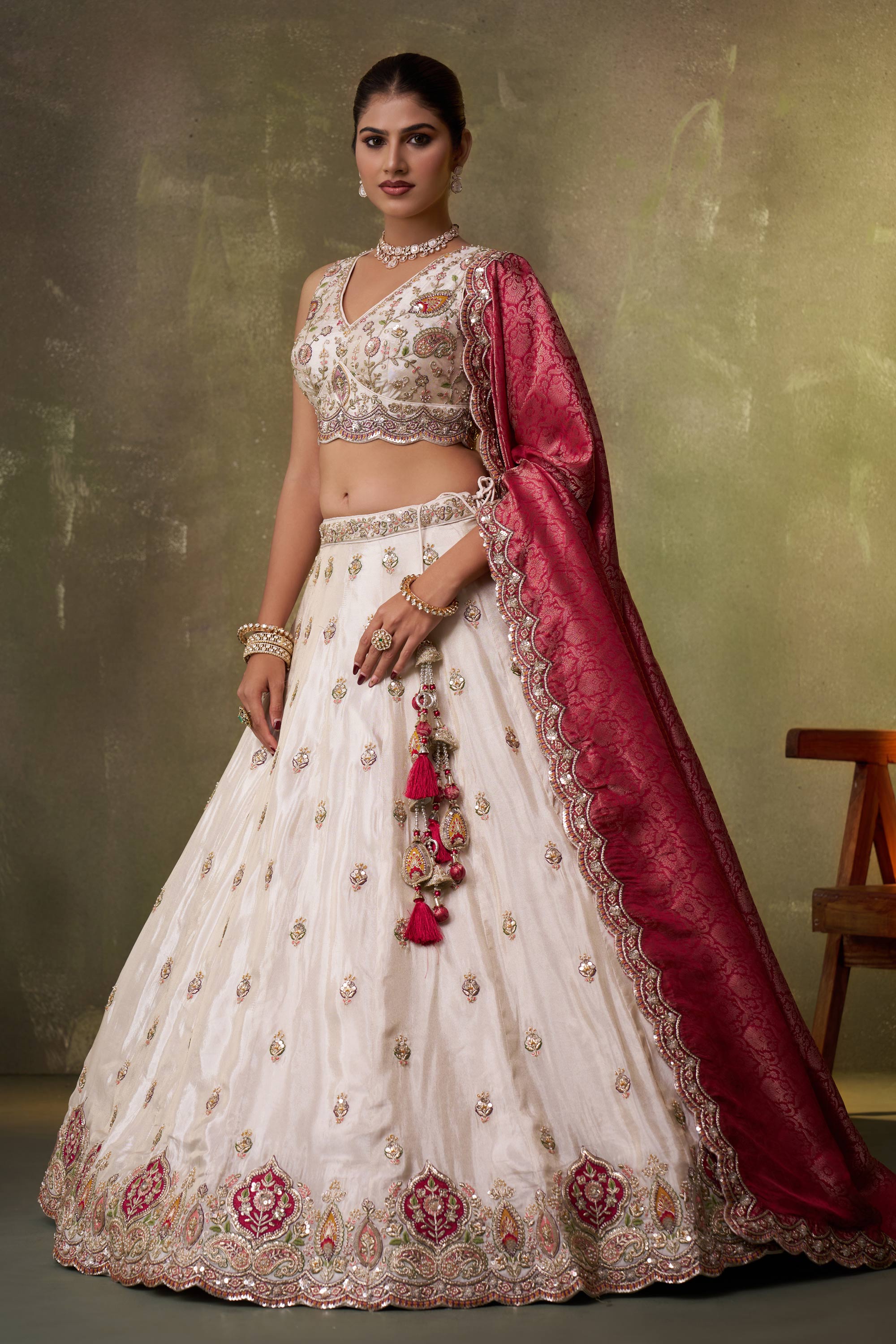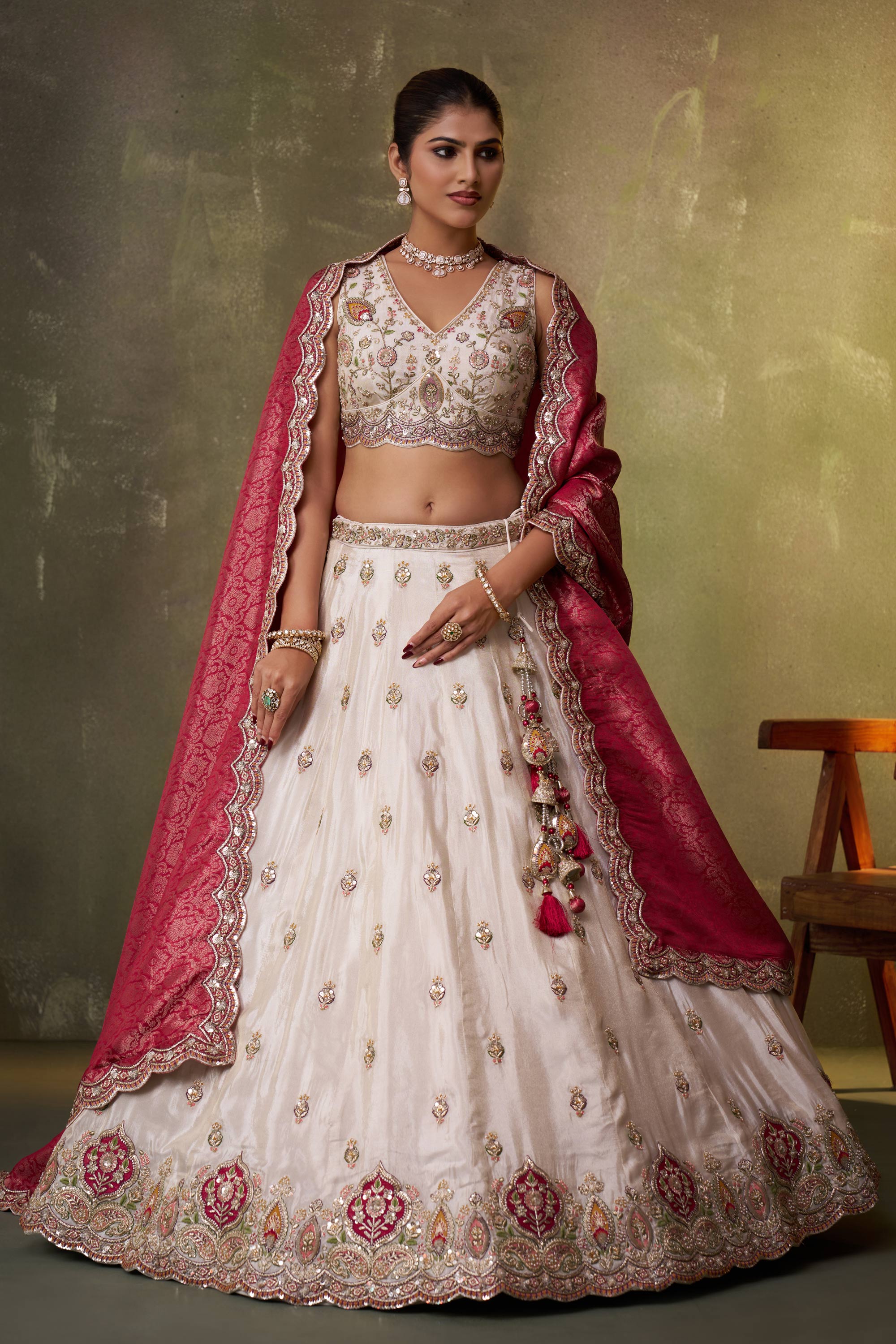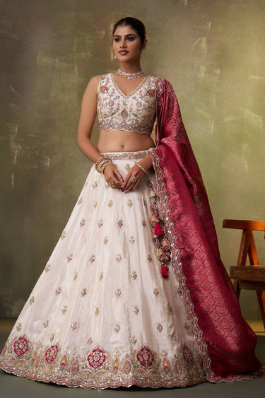 Off White Wedding Wear Tissue Embroidered Lehenga Choli With Dupatta