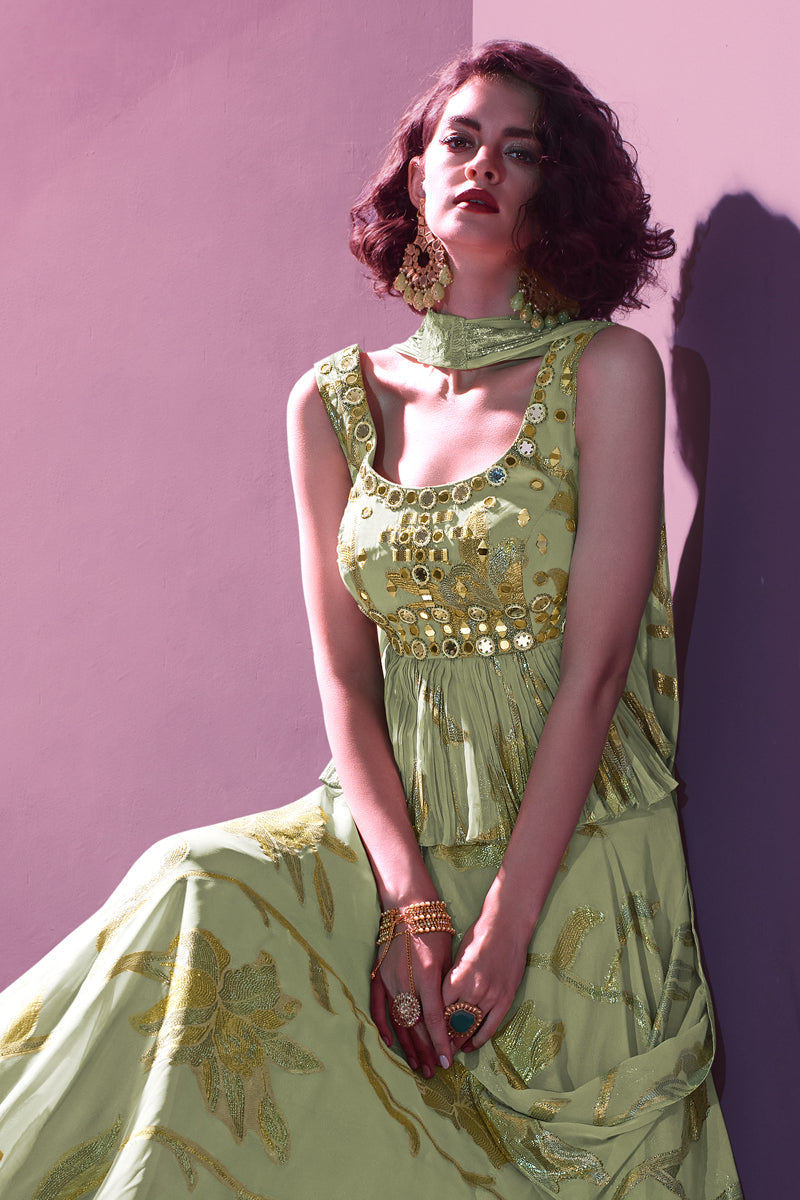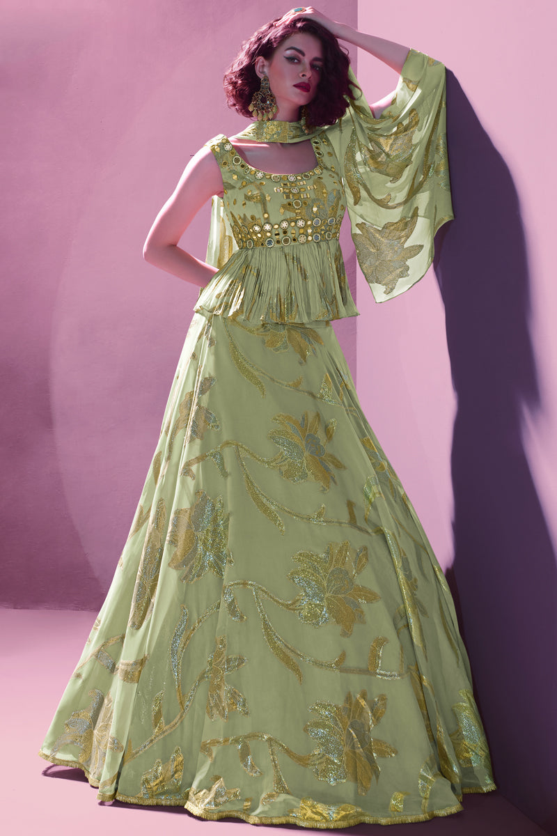 Olive Jacquard Reception Wear 3 Piece Readymade Lehenga With And Blouse
