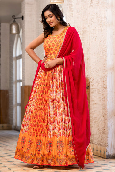 Orange Color Exquisite Digital Printed Readymade Gown With Dupatta In Dola Silk Fabric
