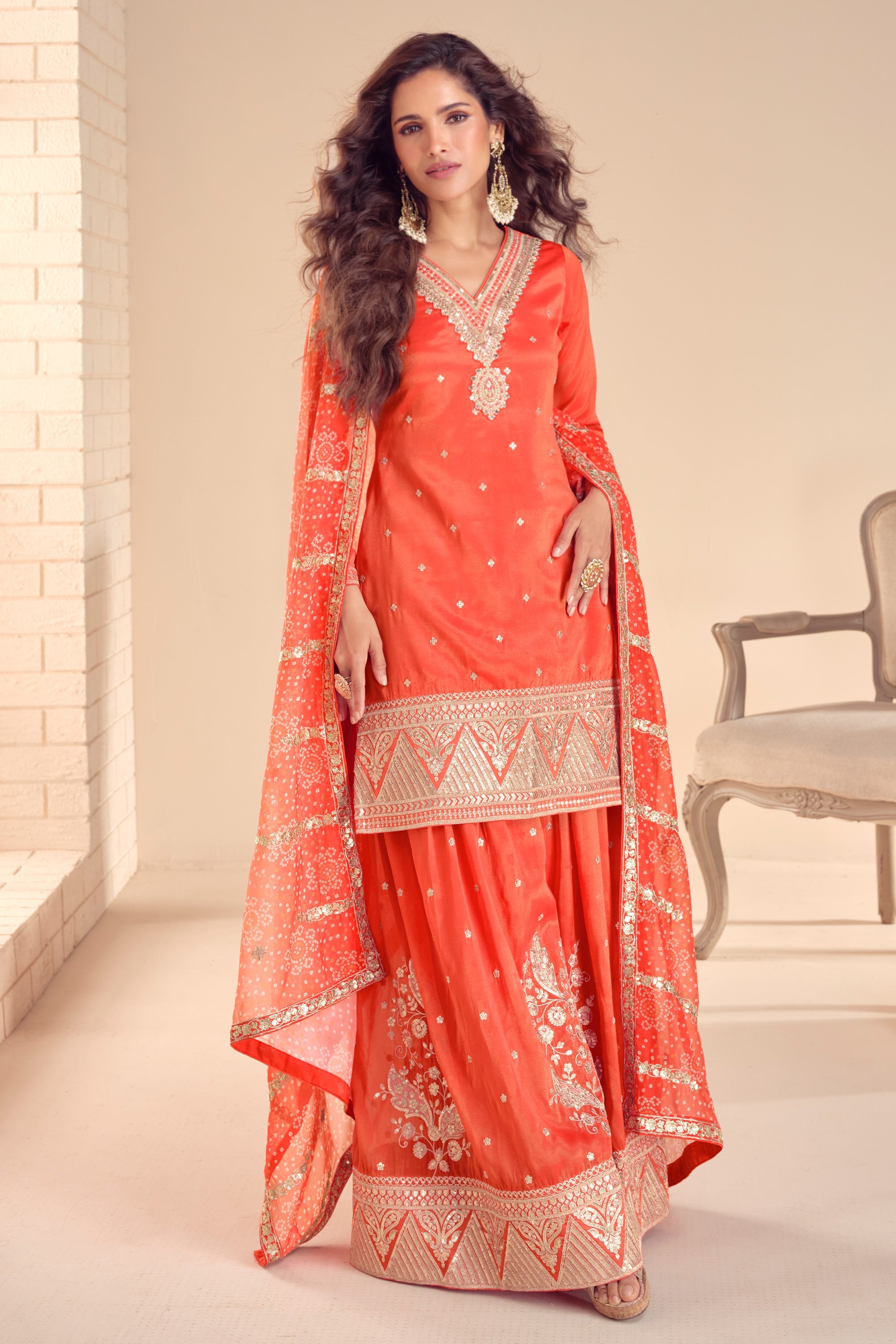 Orange Embroidered Readymade Palazzo Suit