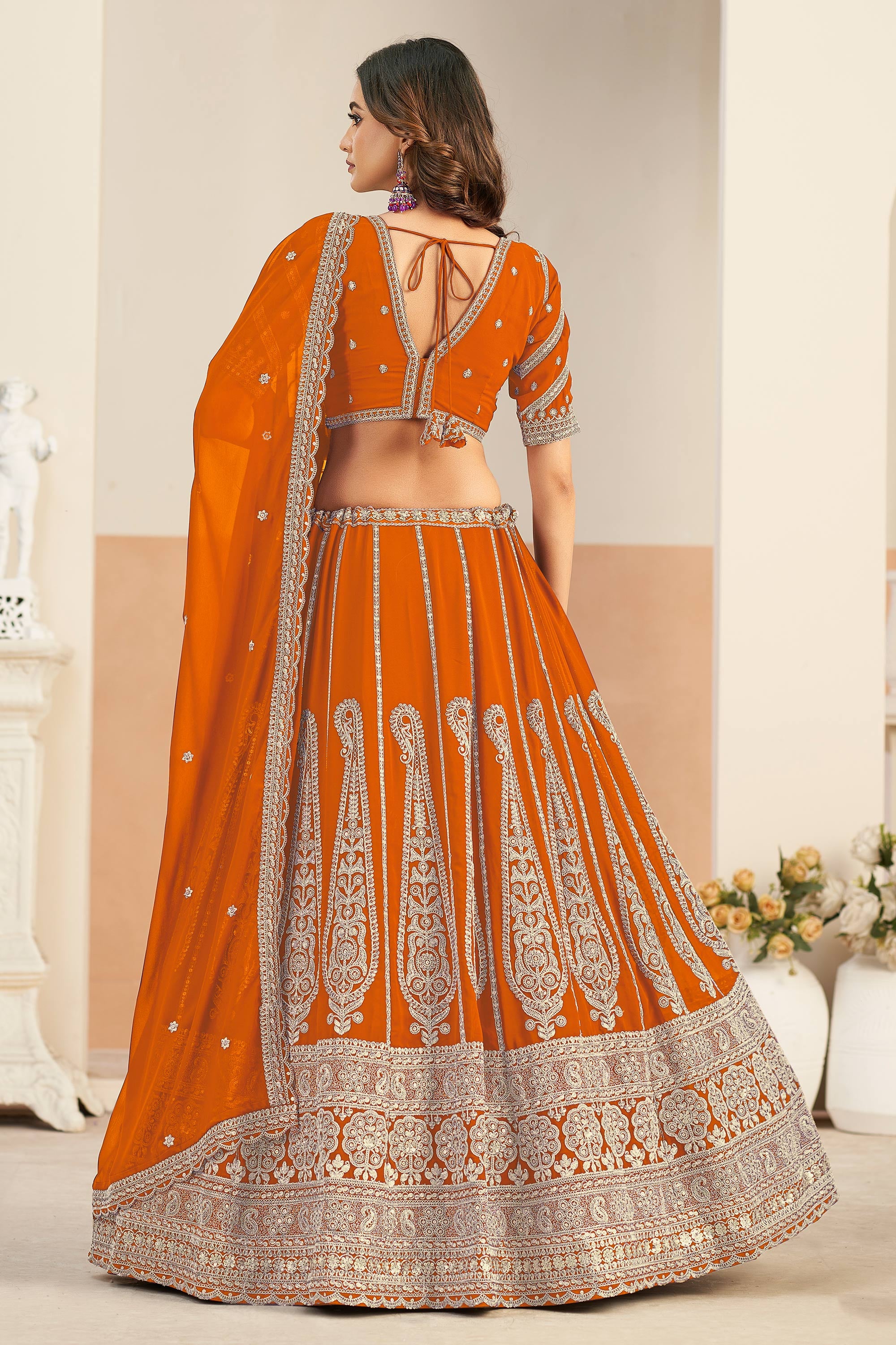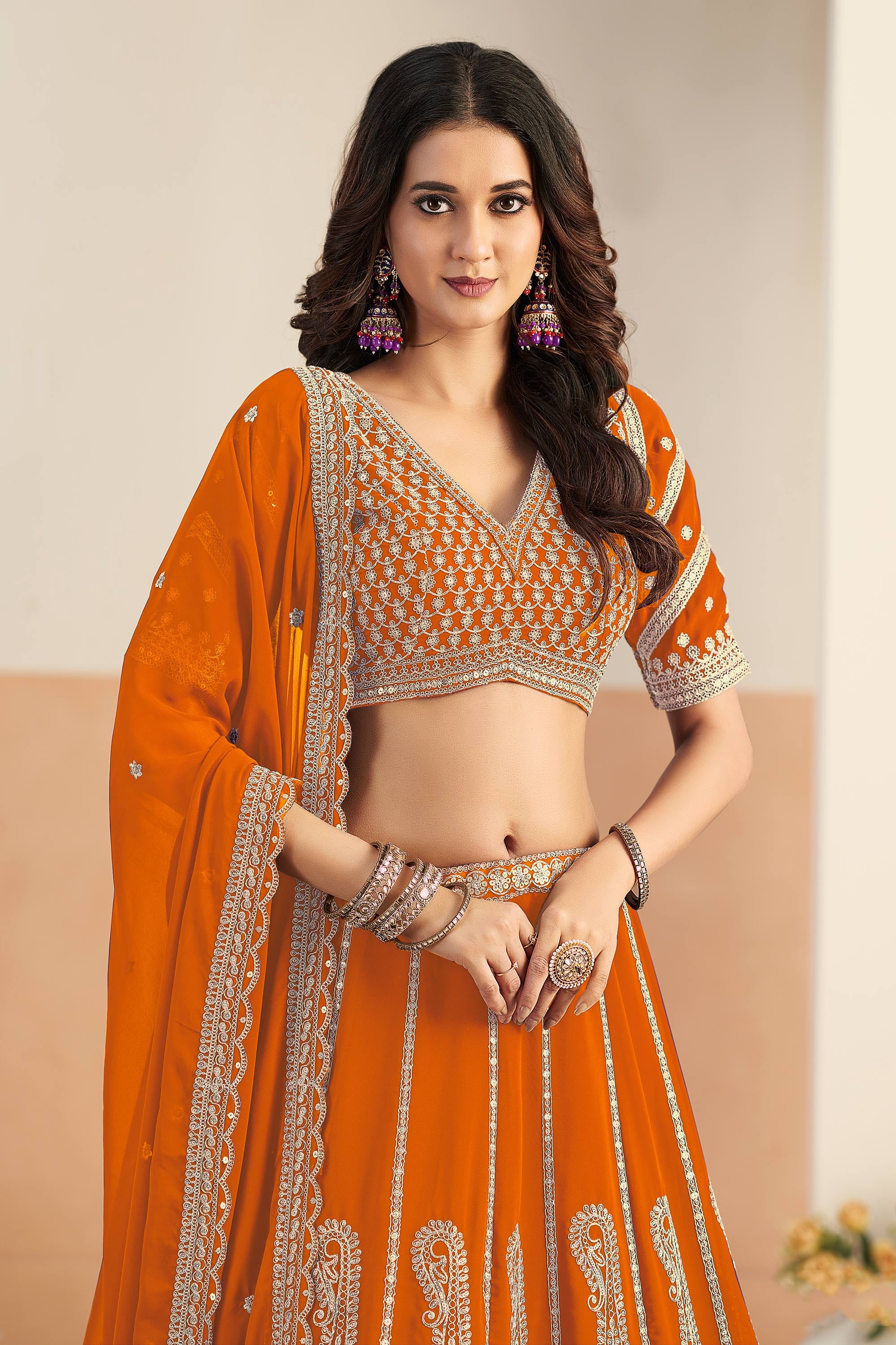 Orange Georgette Embroidered Lehenga Choli