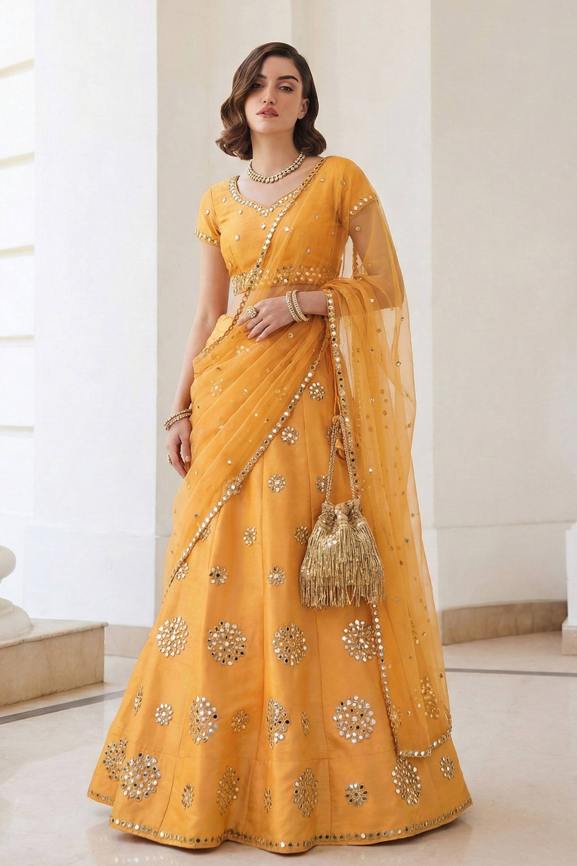 Orange Wedding Wear Silk Mirror Work Lehenga Choli