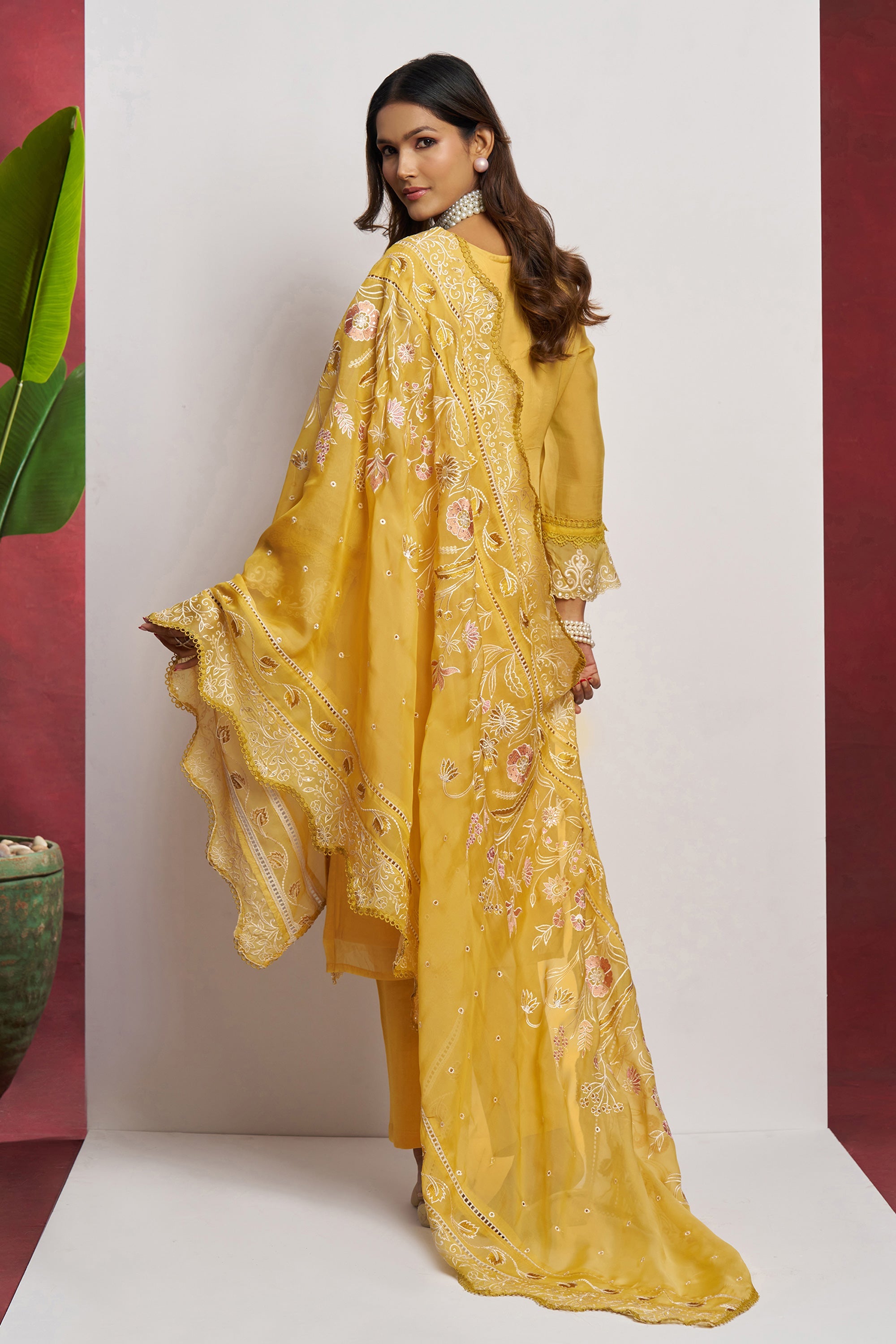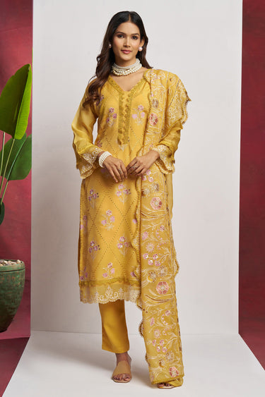 Organza Fabric Embroidered Function Wear Salwar Kameez In Yellow Color