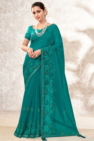 Introducing our exquisite Organza Teal Color Saree, a true masterpiece that combines elegance and sophistication. This saree is meticulously crafted with stunning embroidery work, showcasing intricate details that will leave you mesmerized.