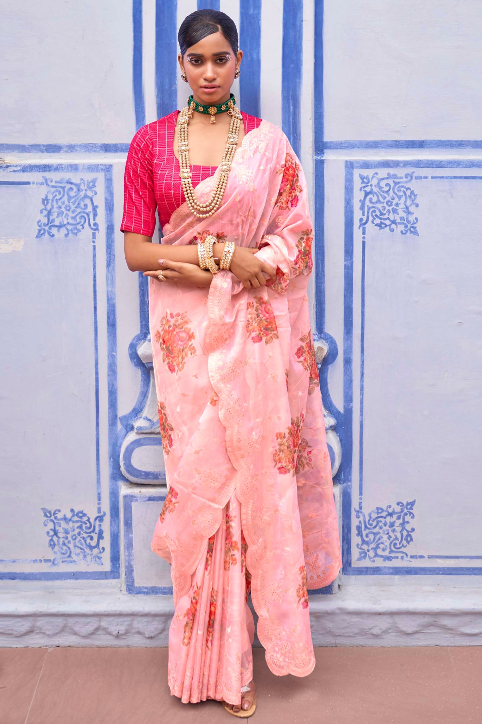 Organza Fabric Pink Color Embroidered Floral Digital Printed Festive Wear Trendy Saree