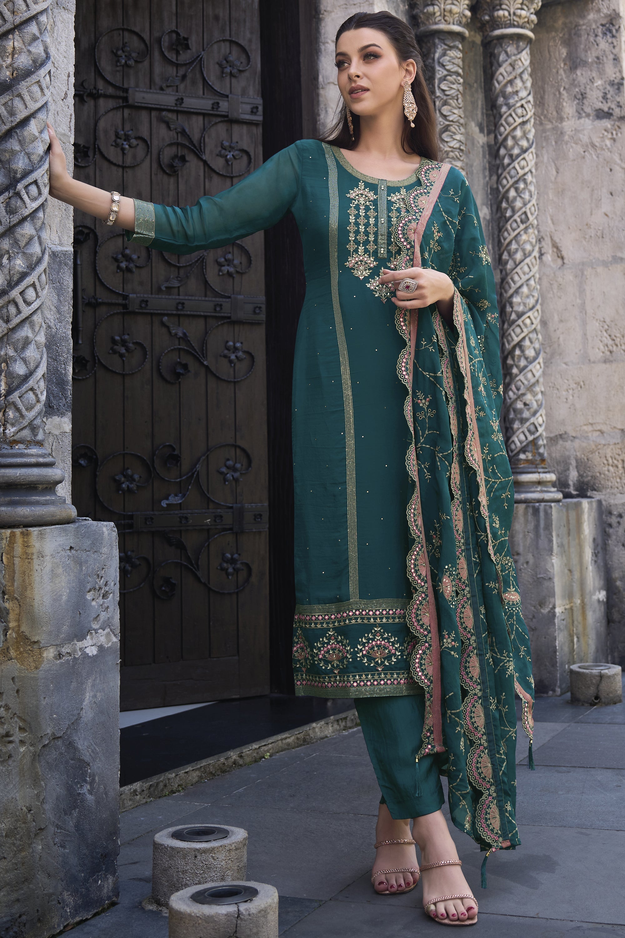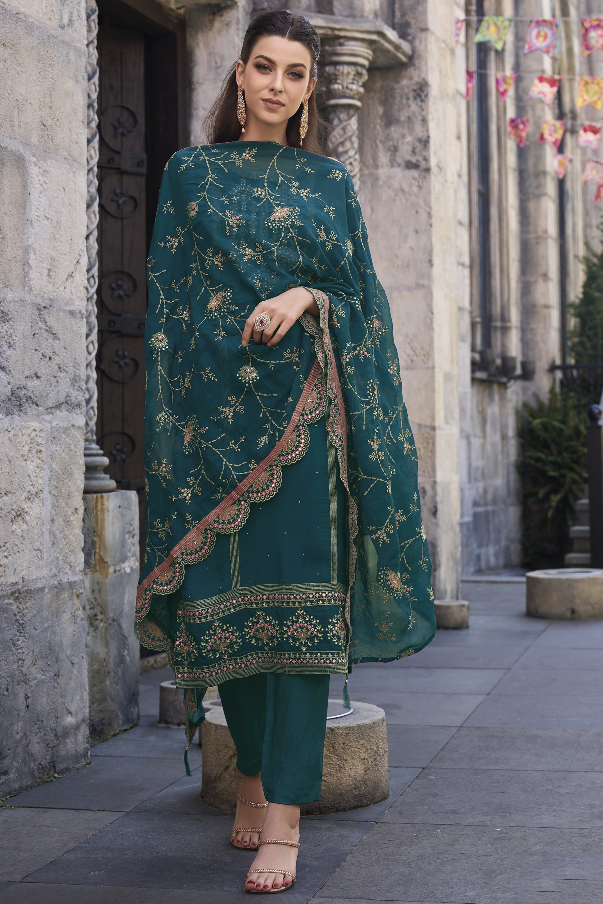 Organza Fabric Teal Color Festive Wear Embroidered Readymade Straight Cut Salwar Kameez
