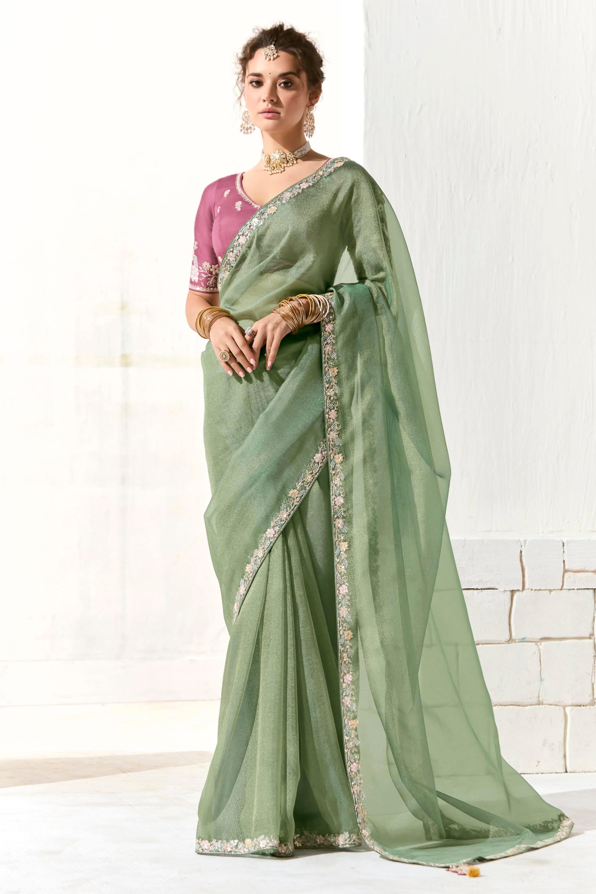 Organza Lace Border Work Saree In Sea Green Color