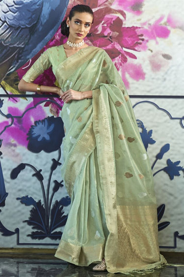 Organza Silk Fabric Wedding Wear Sea Green Color Fancy Zari Weaving Work Saree