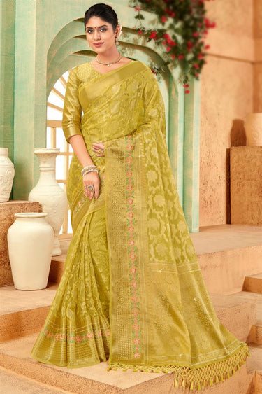 Organza Yellow Color Saree With Winsome Weaving Work