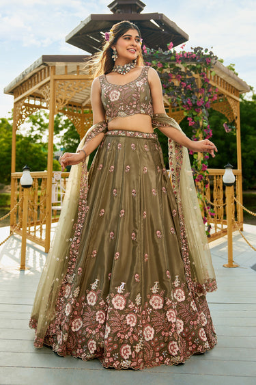 Ornate Heavy Embroidered Wedding Lehenga Choli In Olive Satin Fabric