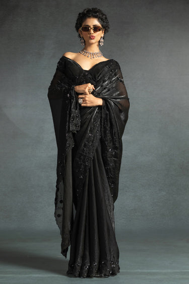 Party Wear Satin Silk Sequins Work Saree In Black Color