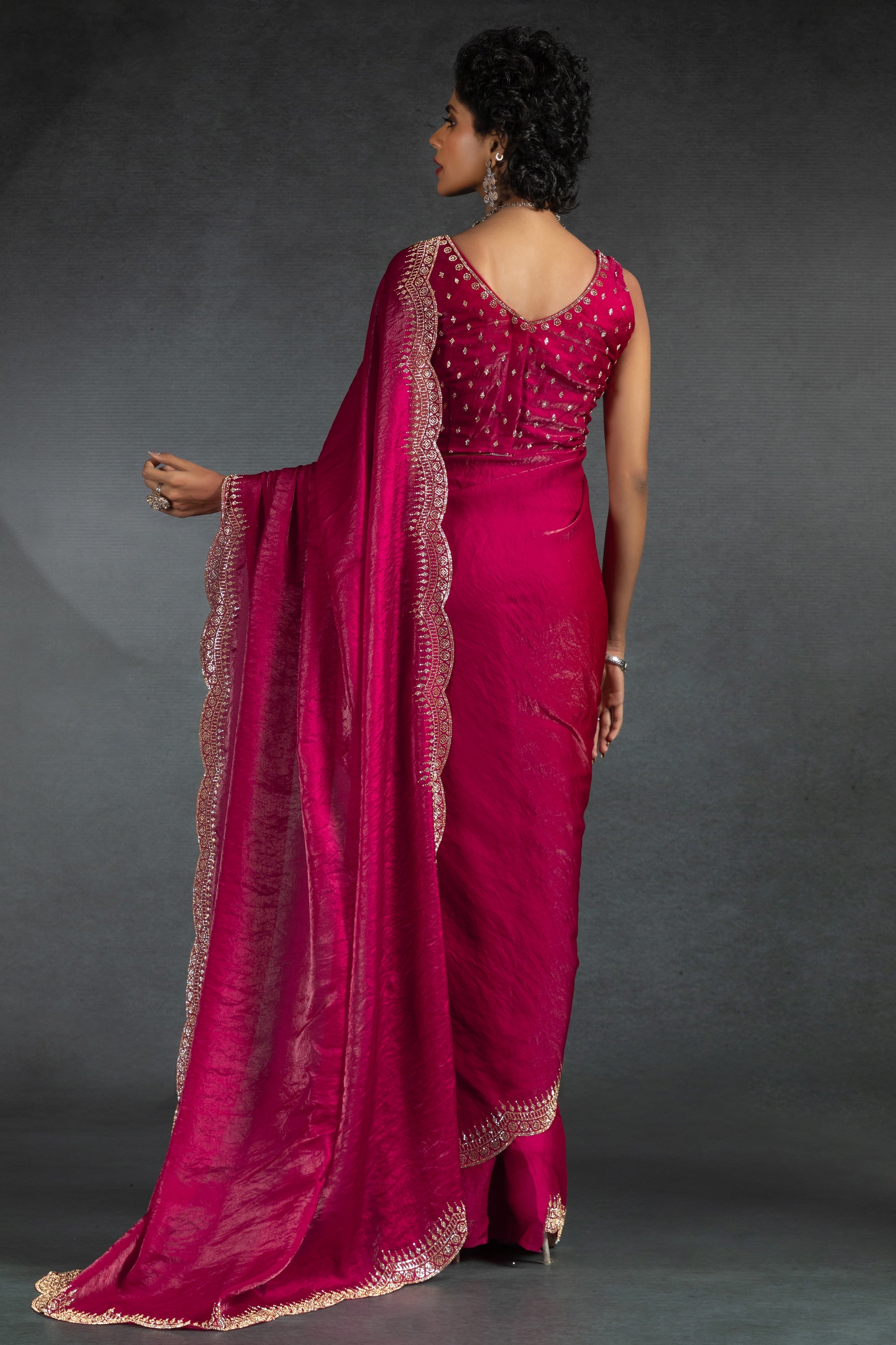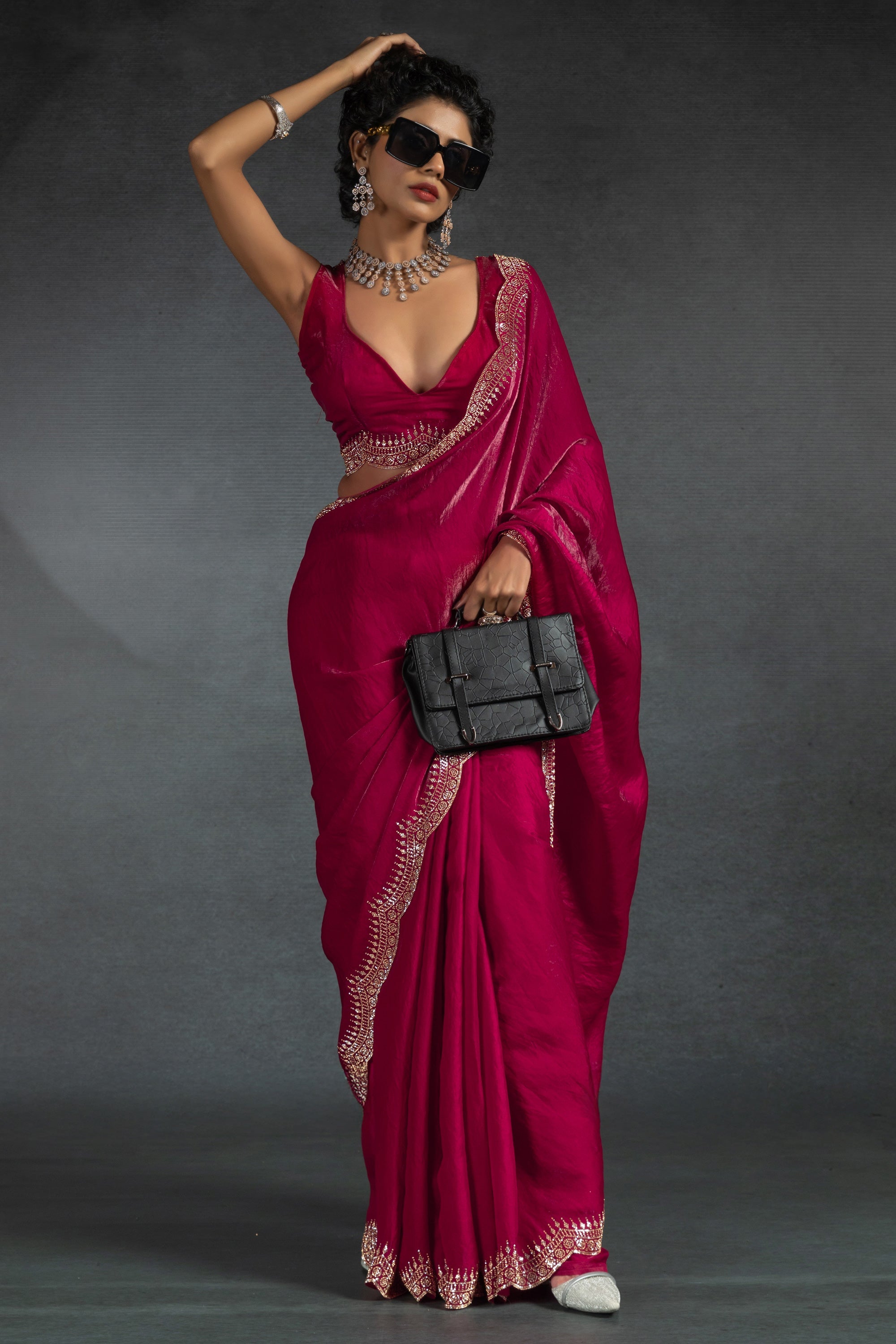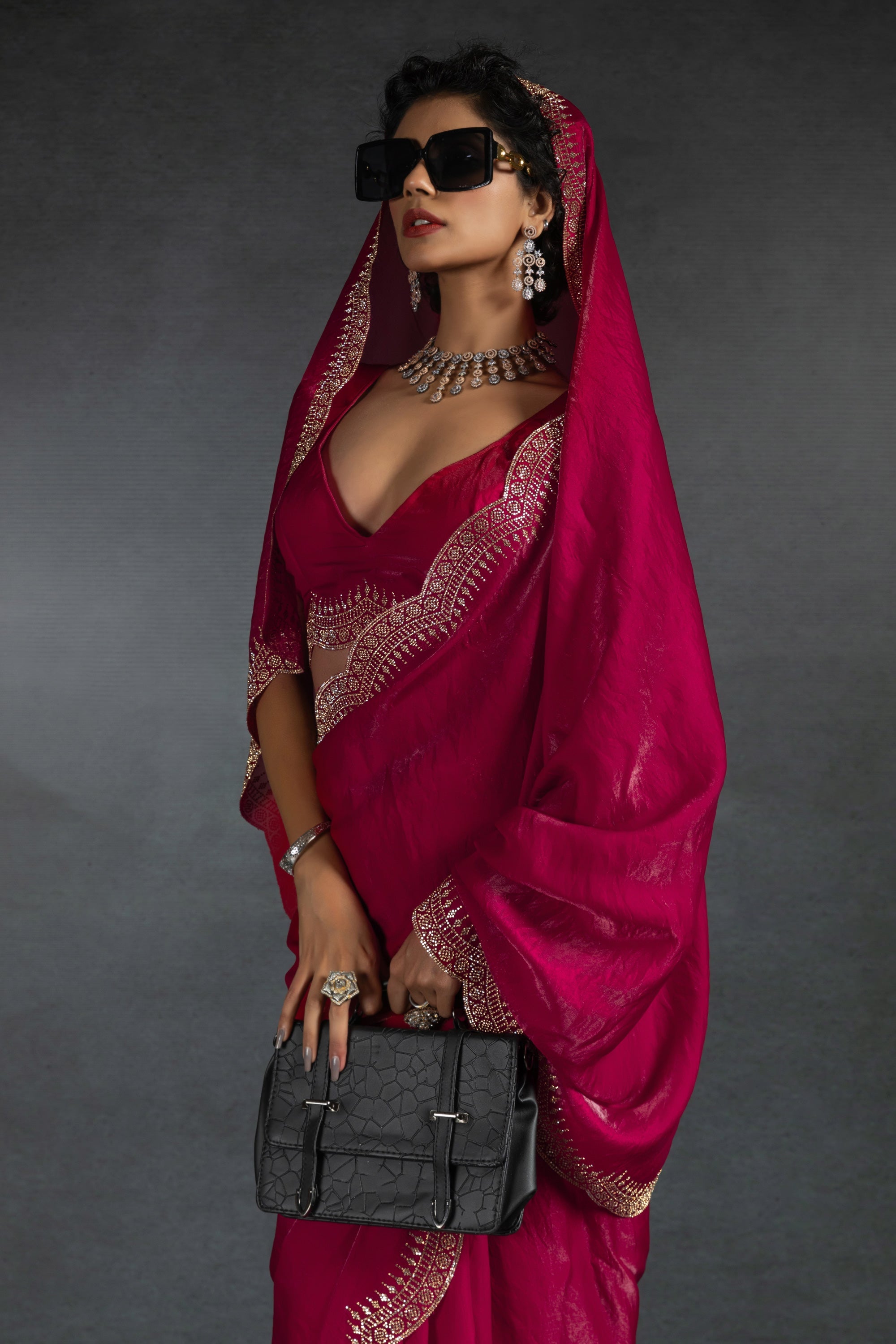 Party Wear Satin Silk Stone Border Work Saree In Rani Color