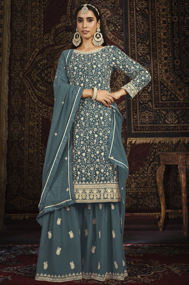 Party Wear Teal Color Palazzo Salwar Suit In Georgette Fabric