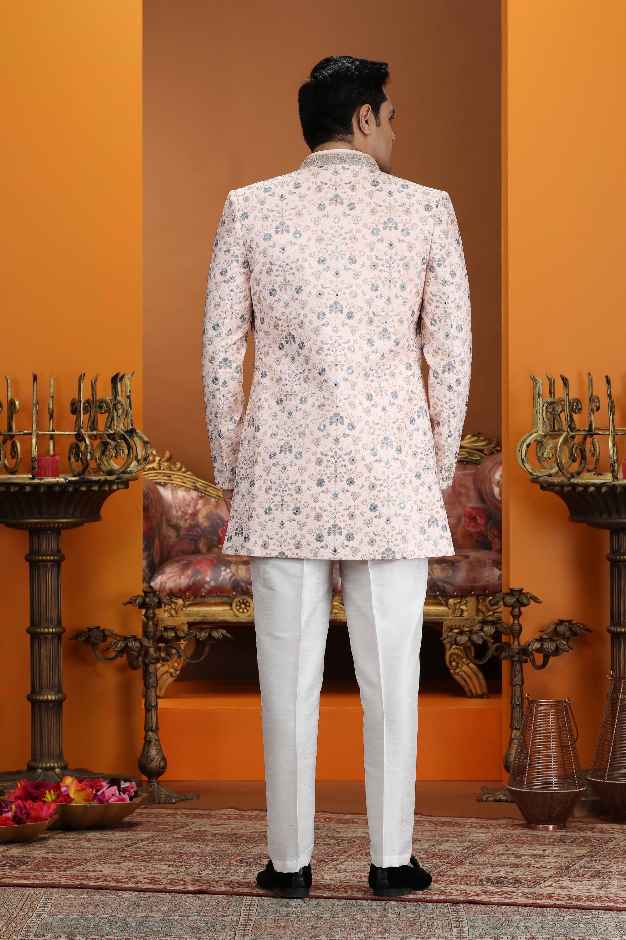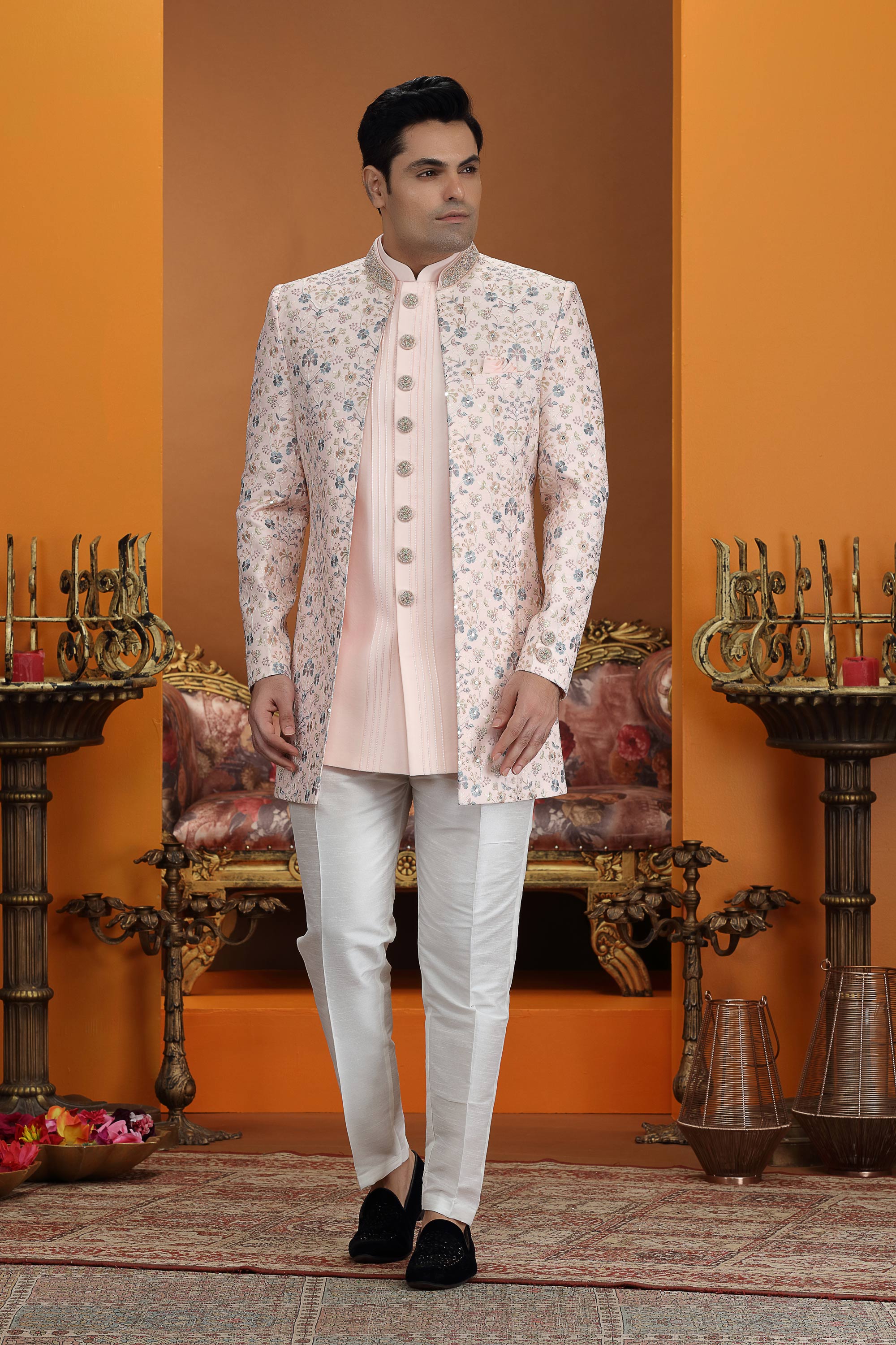 Peach Art Silk Wedding Wear 3 Piece Indo Western For Men