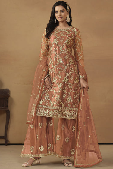 Peach Color Glittering Net Fabric Embroidered Palazzo Suit