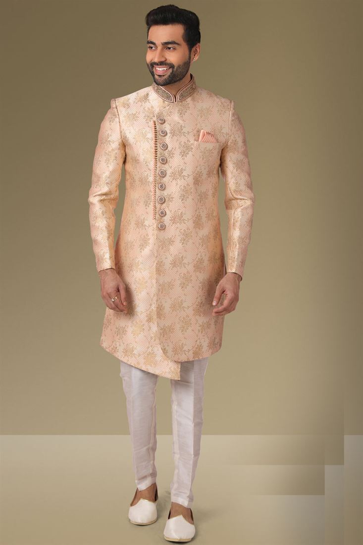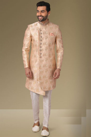Peach Color Jaqurd Silk Fabric Function Wear Sherwani For Man