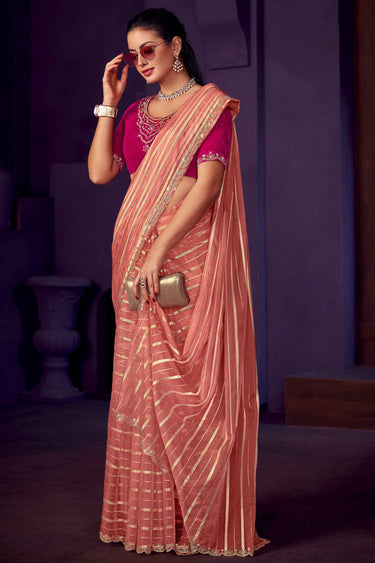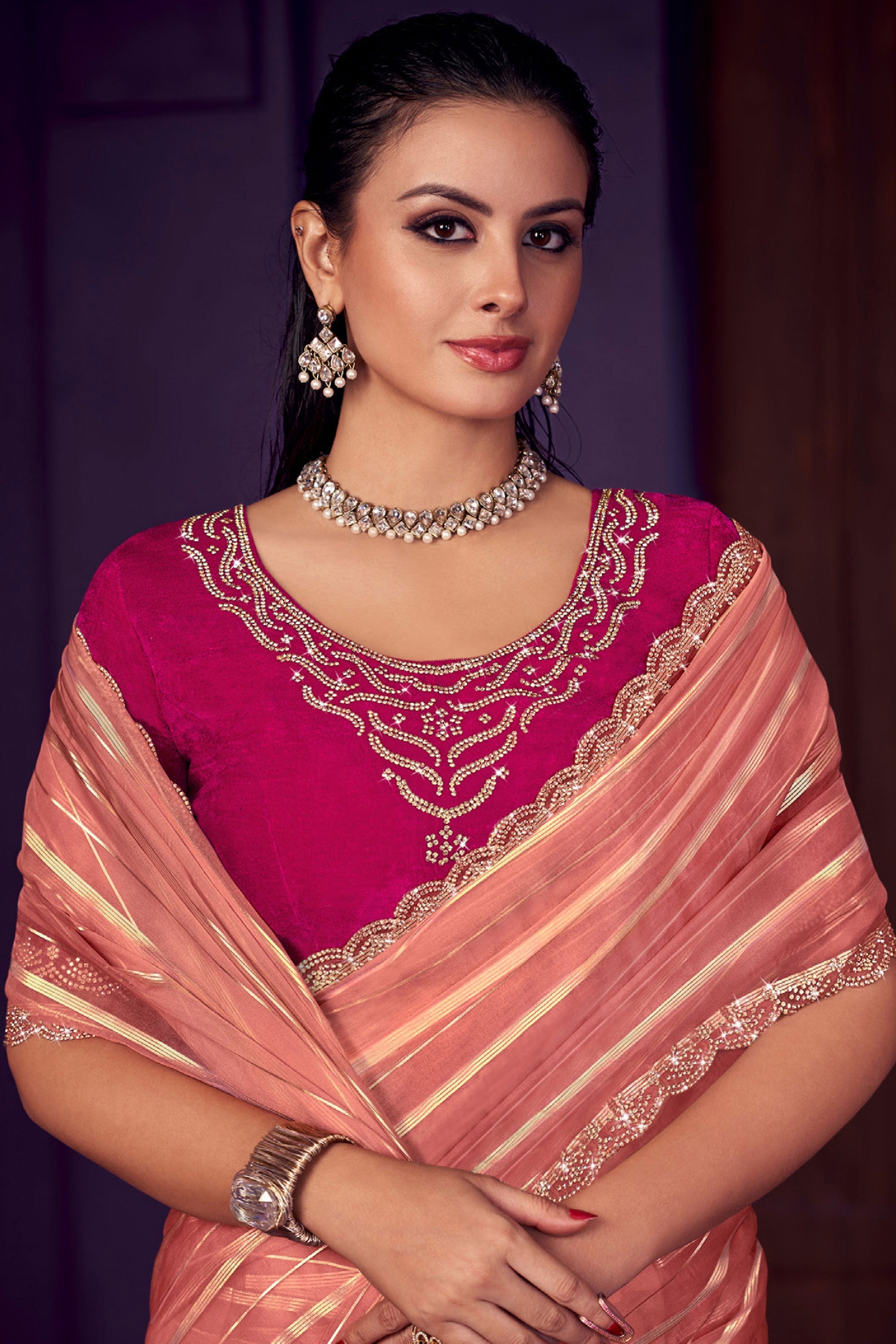 Step up your ethnic fashion game with our stunning Attractive Stone Work Organza Fabric Saree. Made from authentic organza, this saree drapes beautifully. It is highlighted with attractive stone work that makes you stand out in the crowd. The saree is complemented with a velvet blouse piece that is available un-stitched, providing you with an option for custom fitting. Please be aware, the colours might appear slightly different due to the limitations of digital photography.