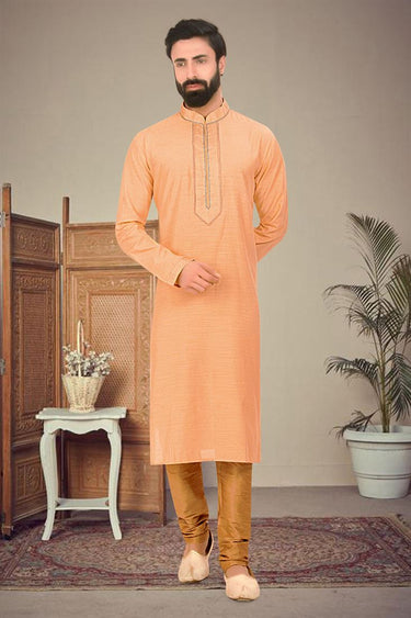 Peach Cotton Fabric Sangeet Wear Trendy Readymade Kurta Pyjama For Men