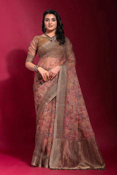 Peach Printed Pure Linen Zari Pattern Checks Saree